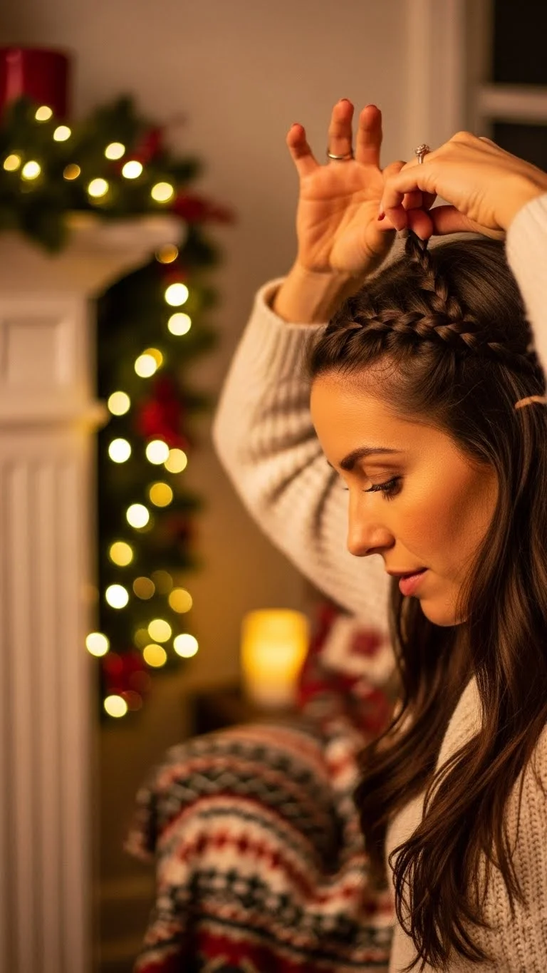 A braided crown gives holiday charm instantly. Take a section near your ear, braid it, and pull it across your head. Secure with two bobby pins behind the opposite ear. Make sure the braid stays loose. If you have fine hair, add a little dry shampoo for grip. Repeat on the other side for more fullness. This look pairs well with knitted sweaters or soft dresses. If your hair is short, use a faux braided headband from accessory shops. It still looks natural in photos.