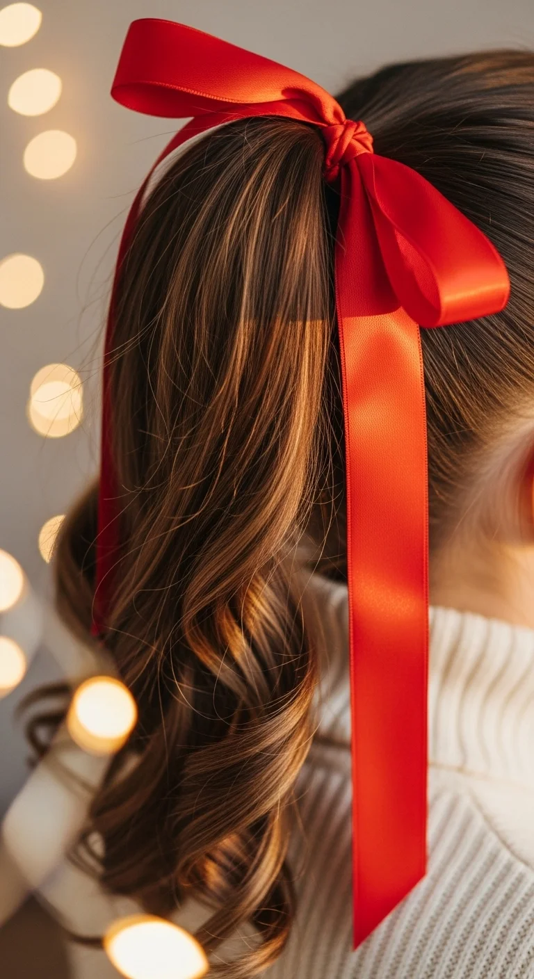 A high ponytail with a bold red ribbon feels simple and festive. Keep the base smooth, then wrap a small section of hair around the elastic for a polished touch. Add a satin bow for color. Use a curling wand on random pieces for soft texture. If you prefer a looser look, tug lightly at the crown. This works on every length that fits into a ponytail. For a budget option, buy ribbon by the yard from a craft store. It costs very little and you can cut several pieces for future events. If your hair slips easily, spray the ribbon with a touch of dry shampoo so it holds better. You can set the style in under five minutes. It’s quick, bright, and suits anything from a sweater to a holiday dress.
