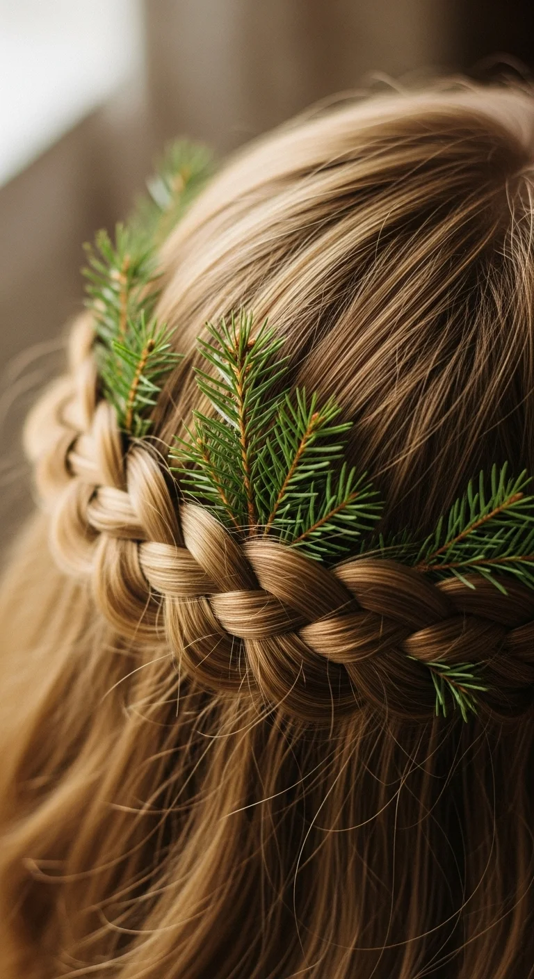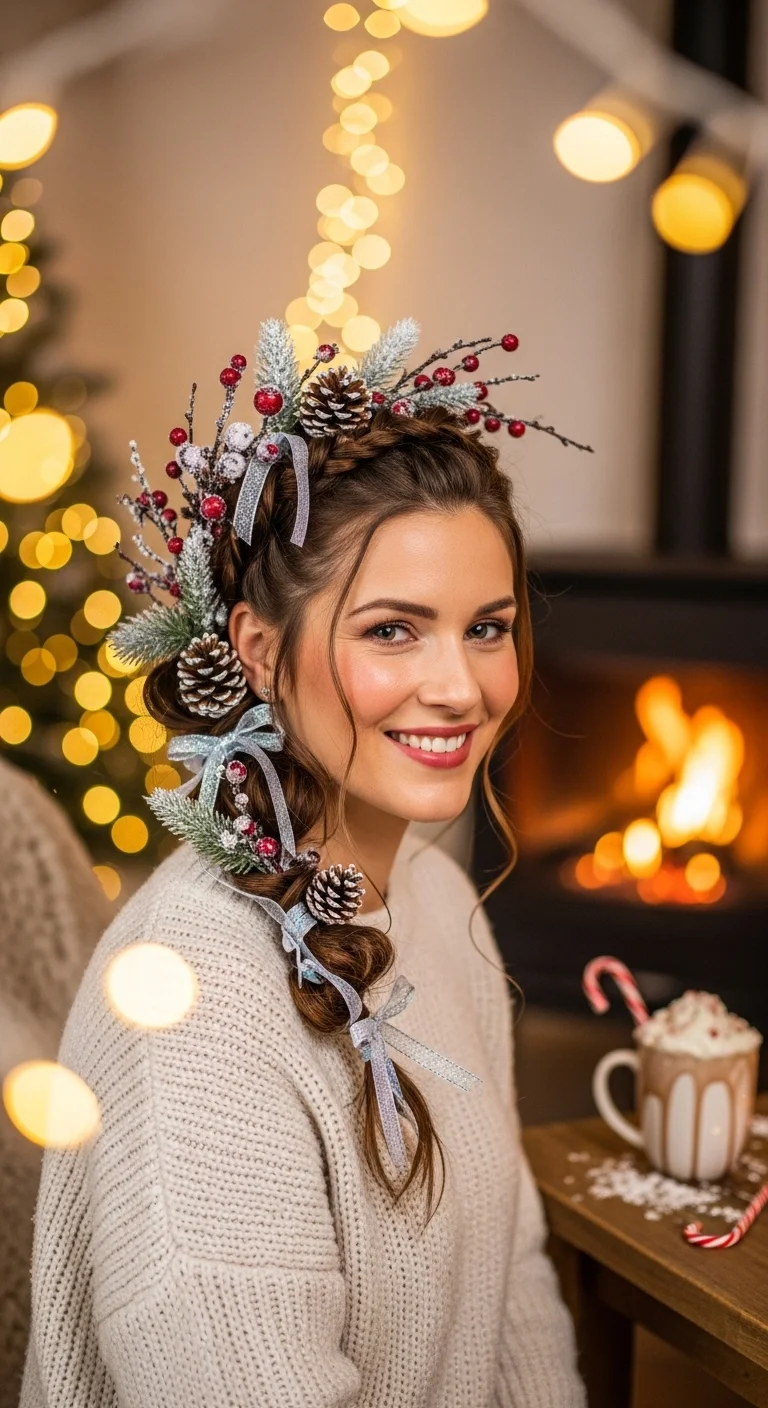 A braided crown always looks cozy for winter. Create two loose braids on each side of your head. Pull them upward and pin them across the top like a halo. Add small green clips or faux evergreen sprigs for a seasonal touch. Craft stores sell small greenery bundles for very low cost. Snip tiny pieces and attach them to bobby pins with floral tape. Keep the braids loose so the style feels soft instead of tight. Tug small sections for volume. If your hair is shorter, use smaller braids and pin them only halfway across. This style stays put all evening and works well for snowy outdoor photos. It pairs nicely with chunky sweaters and simple jewelry.