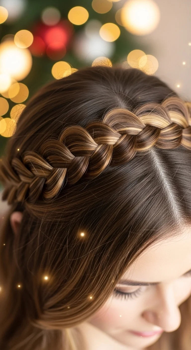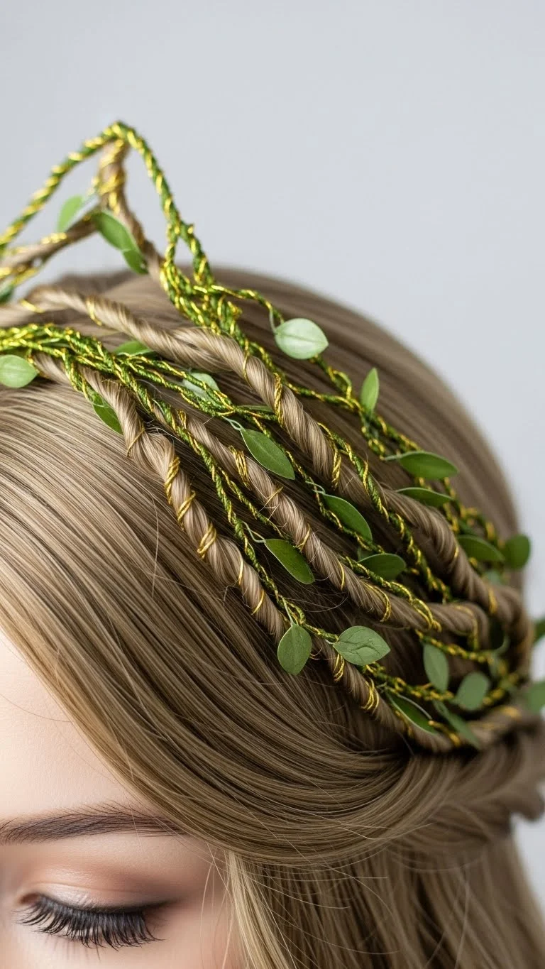 A twisted crown looks festive with green and gold pieces woven through. Create two small twists starting near your temples. Wrap them around the back and pin. Weave in thin metallic thread or tiny greenery. These supplies cost very little and last all season. Keep the twists loose for comfort. Let a few face-framing strands fall out. This style is lightweight and works well for long evenings. It adds seasonal charm without feeling heavy or stiff.
