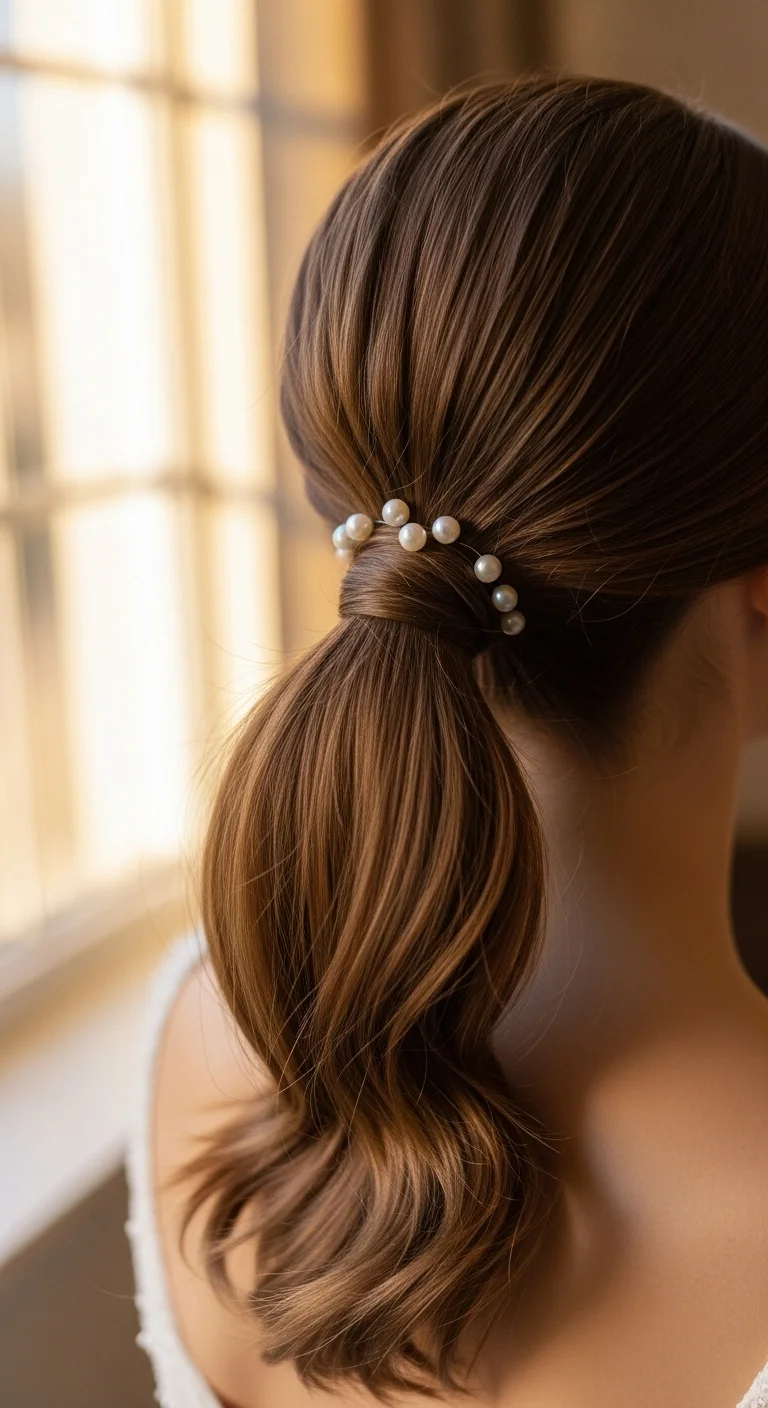A low pony with pearl accents looks soft and festive. Smooth your hair back or leave it natural. Secure a low ponytail. Pin tiny pearl clips around the base. You can buy mixed-size pearl pins for a few dollars online. Brush the ponytail lightly for a sleek finish. Add a gentle curl at the ends if you want movement. This style works well with turtlenecks and soft sweaters.