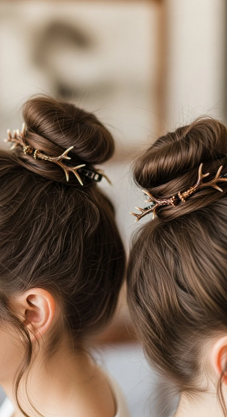 Space buns become holiday-ready with tiny antler-shaped clips. Part your hair down the middle. Create two high buns. Keep them loose and playful. Add brown or gold pins shaped like antlers or use simple V-shaped clips. Kids’ craft sections often sell small shapes you can glue to bobby pins. This look is fun for parties or themed events. If your hair is short, create mini buns instead.