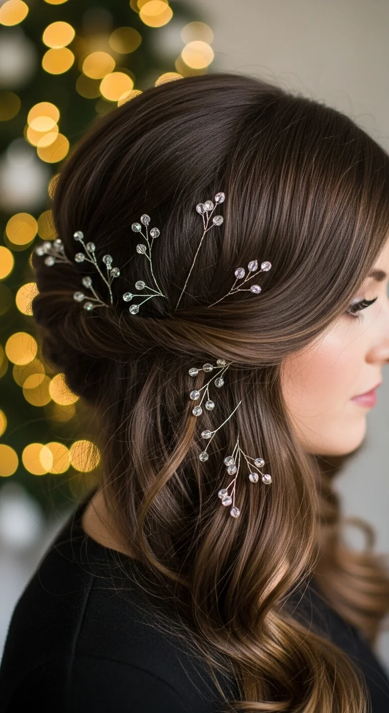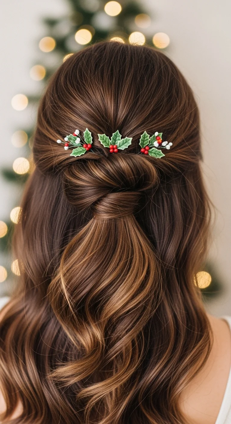 A half-up style with tiny holly accents looks sweet and subtle. Pull the top section of your hair back and secure it with a few pins. Add small faux holly berries or green clips for detail. Craft stores sell mini holiday pieces that can be pinned easily. Keep the lower section loose. Add gentle curls if you like. This style works well for shorter cuts too. Use tiny pieces so the style stays understated and comfortable. It suits everything from simple cardigans to holiday dresses.