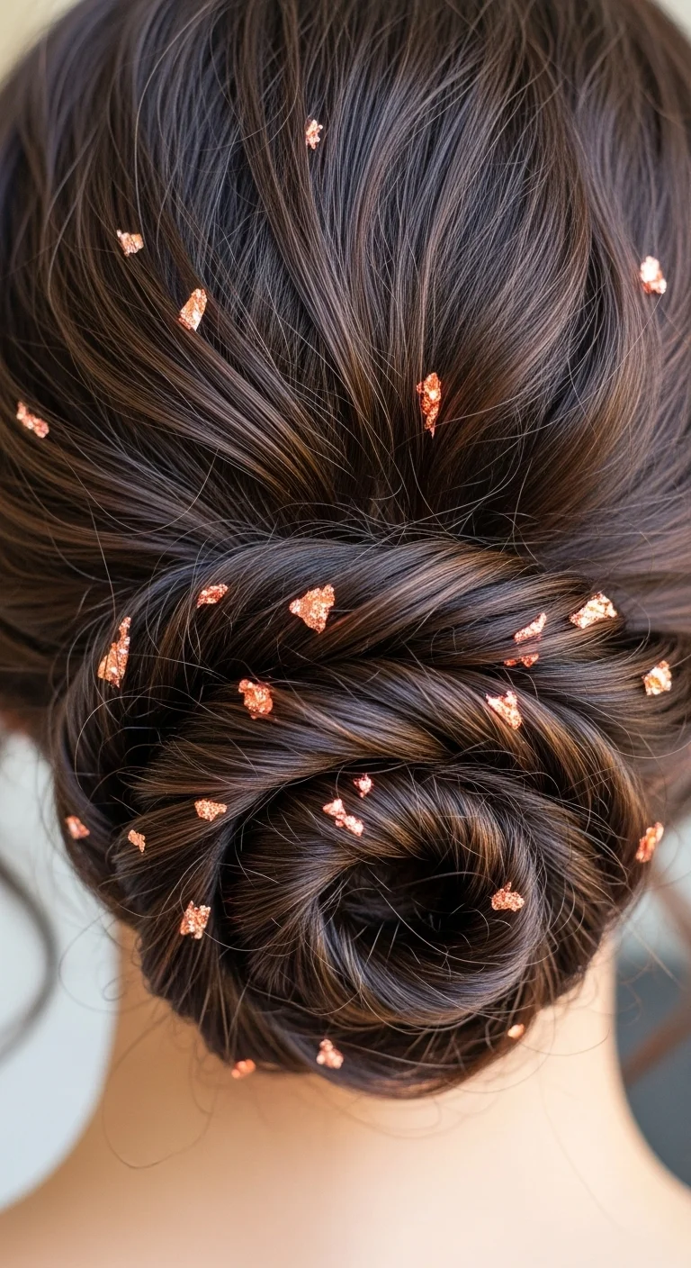 A soft, swirled bun gives cozy “cinnamon bun” vibes. Create a ponytail. Braid it, then wrap it into a bun. This adds texture and shape. Secure with pins. Add warm-toned clips like copper or bronze. These shades blend nicely with most hair colors. If you want fullness, pancake the braid before wrapping. Use inexpensive copper bobby pins for color contrast. This style feels snug and stays put during long gatherings.