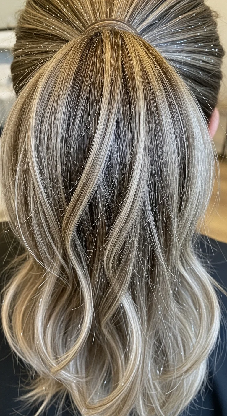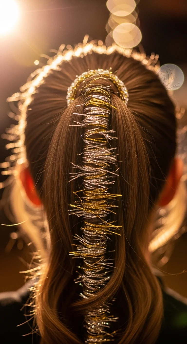 Add thin strands of hair tinsel for sparkle. Tie your ponytail at any height you like. Clip in small tinsel strands near the base. These cost only a few dollars and last for several days. Brush lightly so the strands blend with your hair. Keep the ponytail smooth or wavy. This style feels fun for parties or photos without feeling heavy.