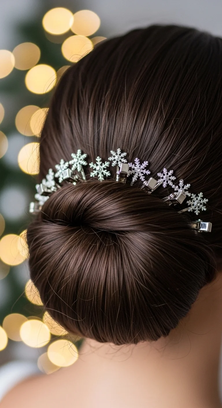 A low bun with silver accents gives a soft winter vibe. Part your hair down the center or keep it natural. Gather it at the nape and twist into a bun. Pin it loosely to keep it relaxed. Add small metallic clips or pearl pins for gentle shimmer. You don’t need fancy accessories—simple metallic bobby pins from a dollar shop work well. Spray a little water on your brush to smooth flyaways without stiff hairspray. If your hair feels too slippery, braid the ponytail before wrapping it into a bun. This adds grip and shape. Leave a few face-framing pieces out to make the look softer. It’s easy to recreate even on rushed mornings and holds up through long gatherings. Pair it with cozy scarves or a sparkly top for a balanced, warm look.