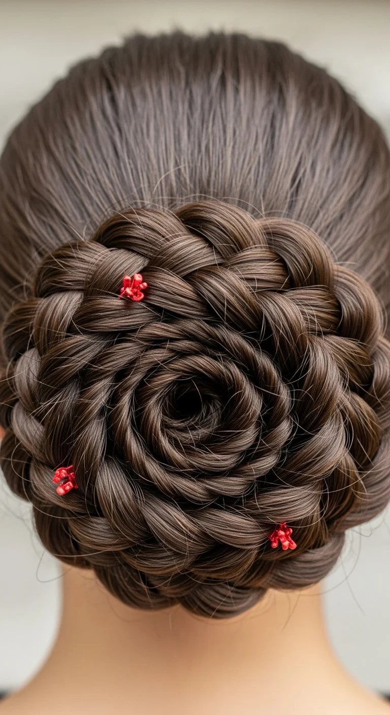 A twisted bun shaped into a soft rose adds seasonal color. Create a low ponytail. Twist sections and wrap them to mimic petals. Pin as you go. Add small red clips to echo rose tones. This style looks more complex than it is. Break it into small steps and keep the twists loose. Perfect for dinners or photo sessions.