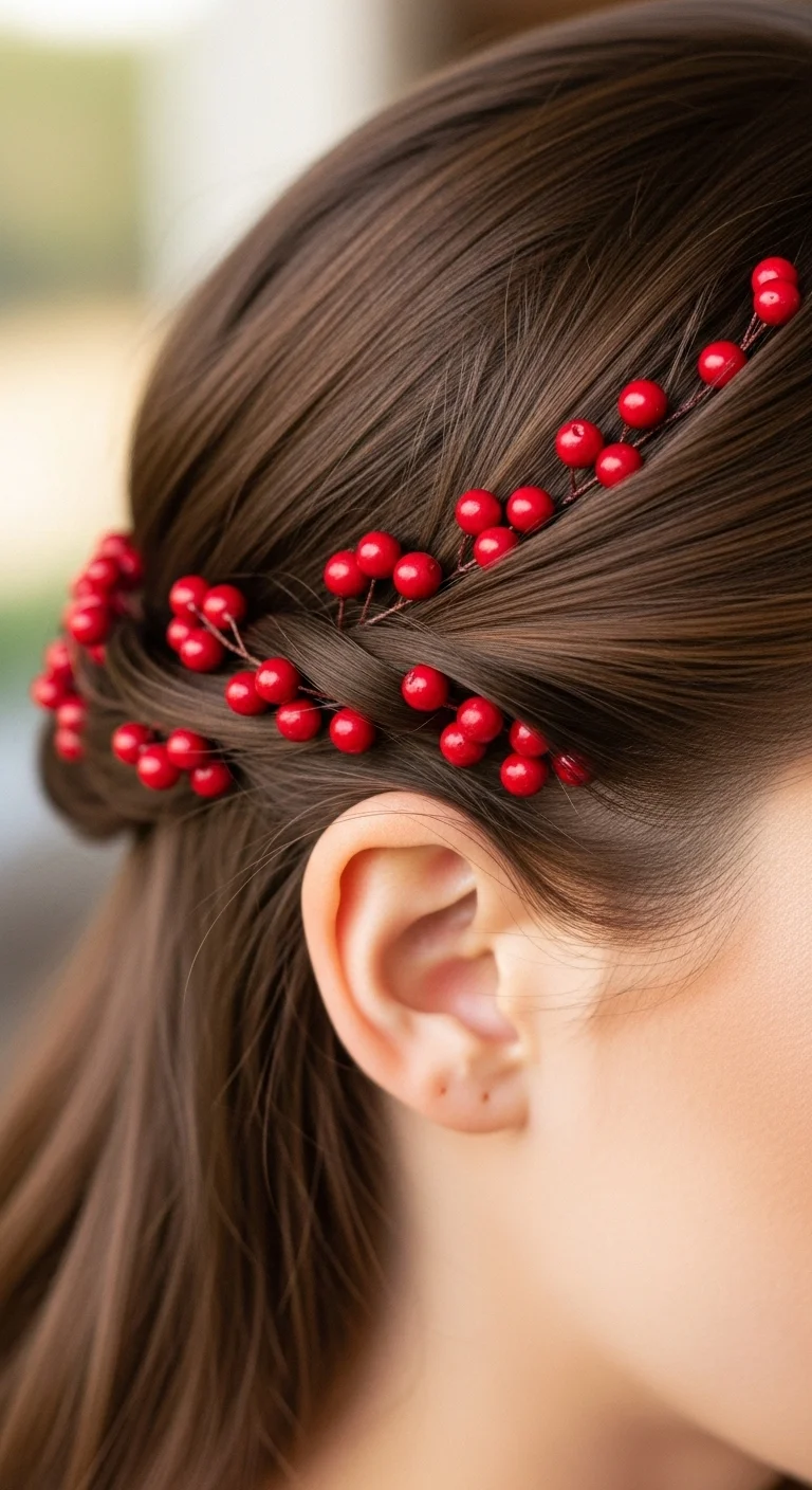 Twist a small section near your temple and pin it back. Add small red berry clips for seasonal detail. Leave the rest of your hair loose. Curl the ends if you want extra movement. This style takes two minutes and works for any length. It’s an easy fix for busy days.