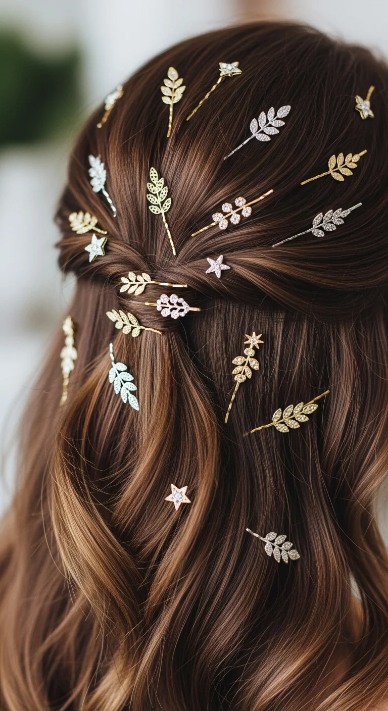 Scatter tiny clips throughout your hair for sparkle. Use a mix of gold and silver mini clips. Place them randomly for a soft twinkling effect. This works with curls, waves, or straight textures. Mini clips cost very little and can be reused all season. It’s an easy way to brighten simple styles.