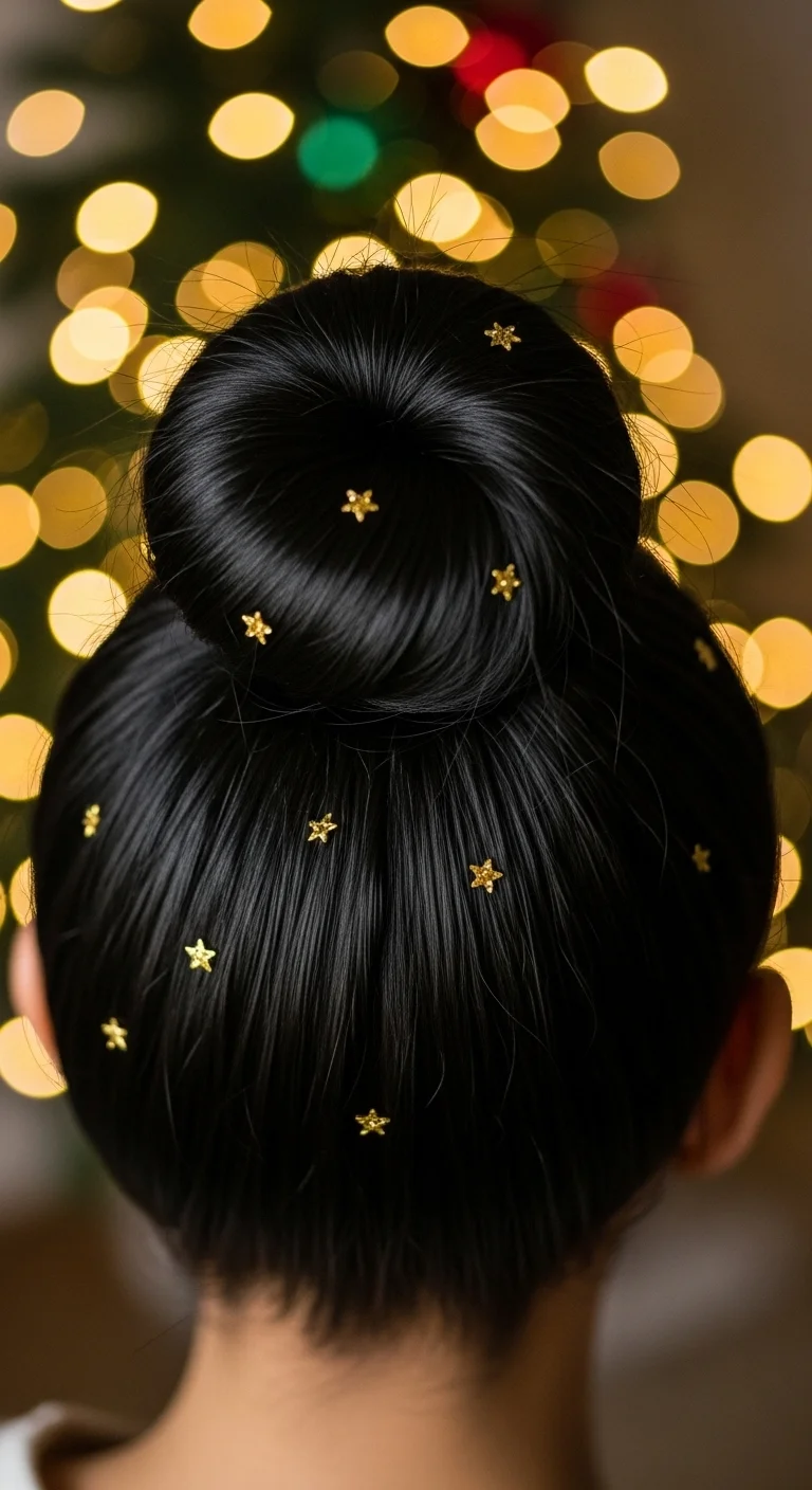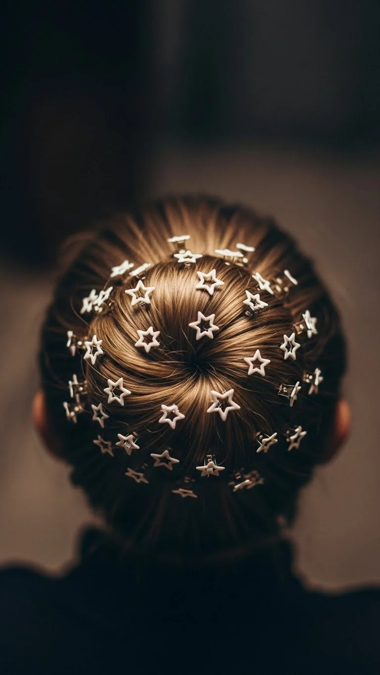 A simple bun becomes festive with star-shaped clips. Create any bun you like—high, mid, or low. Scatter star pins all around it. You can buy multipacks online or make your own with small charms and glue. Keep the bun loose so the stars stand out. This style works for all ages and all hair types.