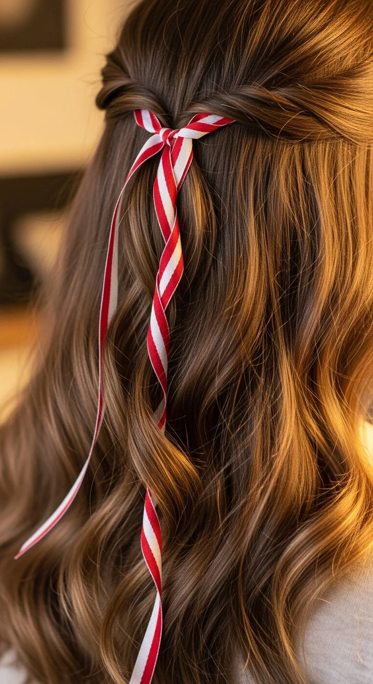 Soft waves paired with candy cane ribbon feel playful without going overboard. Start with loose curls. Brush them lightly so they fall into flowing waves. Cut a thin red-and-white ribbon and weave it through a small braid near your temple. Clip it into place at the back so the ribbon blends with the waves. Use ribbon from gift-wrap sections to save money. You can swap red-and-white for gold or green if you prefer subtle color. This works well on medium or long hair and looks great tossed over one shoulder. Keep the waves relaxed so the ribbon stands out. Add a light mist of flexible spray if your hair doesn’t hold texture well. This style feels fun for cookie swaps, school events, or casual dinners.