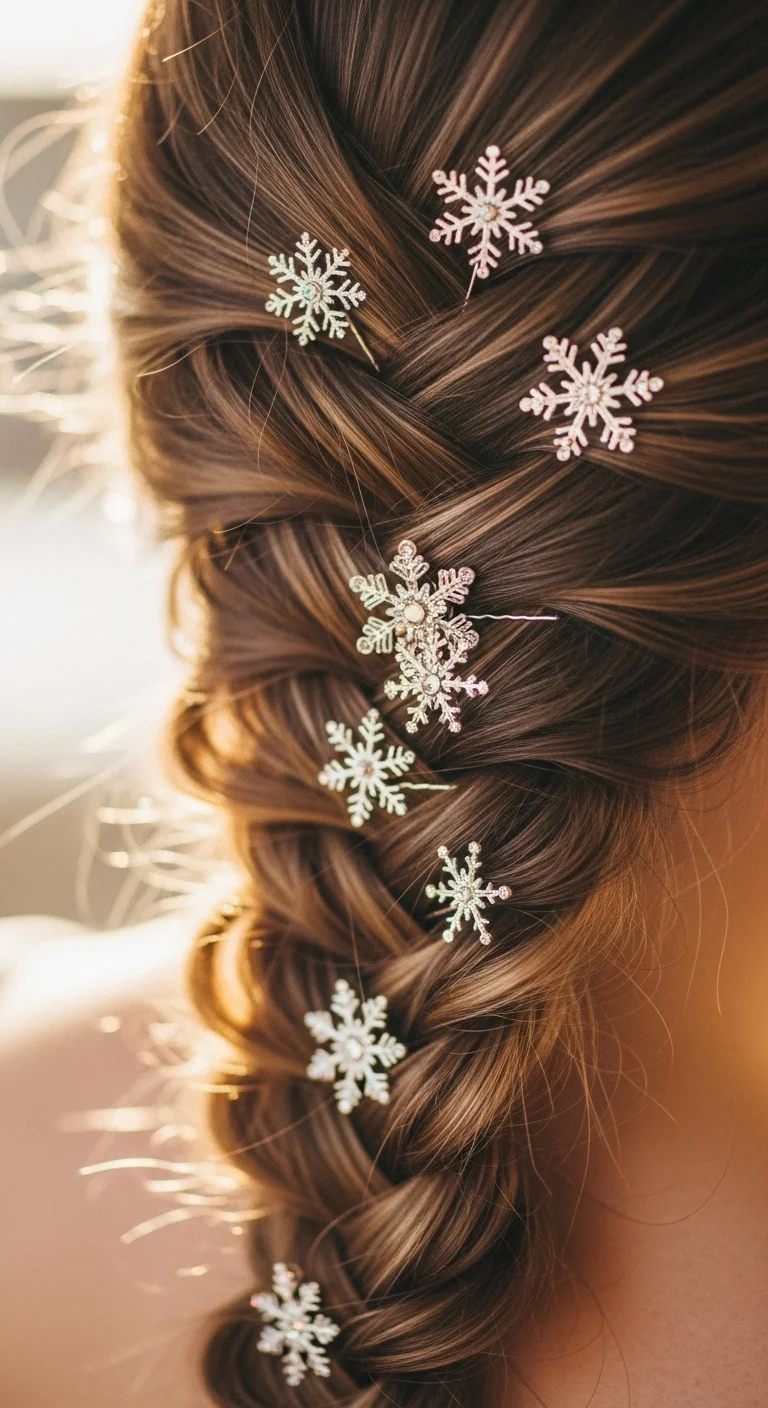 Create a simple side braid and dress it up with tiny snowflake clips. Sweep all your hair to one side. Braid loosely so it appears full and soft. Insert small snowflake pins down the braid. You can find inexpensive ones online or make your own using flat charms and glue. Tug pieces around the crown for an airy look. This suits curling or straight textures. If your hair slips, add dry shampoo at the roots for grip. This braid holds well during long events and works with scarves or high-neck sweaters.