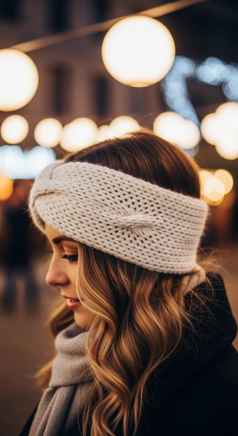 A chunky knit headband turns simple waves into a warm holiday style. Curl your hair lightly or braid it overnight for natural waves. Slide the headband over your ears for a snug feel. Pull small pieces forward to frame your face. The headband hides any roots or flat areas, which saves time on busy mornings. Pick neutral colors like cream or gray for easy pairing. You can find these headbands at dollar bins or thrift stores for a few dollars. This look works outdoors, at markets, or at casual family gatherings.