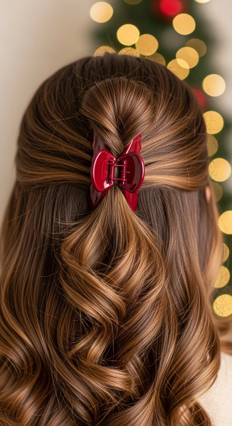 A deep red claw clip adds holiday charm in seconds. Gather your hair into a twist at the back and secure it with a cranberry-colored clip. Let the ends fall naturally for softness. Curl just the ends if you want more movement. Claw clips are cheap and come in many shapes. Pick matte options for a modern look. This style holds well on medium or long hair and feels comfortable for all-day wear. It’s perfect when you want something effortless but still festive.