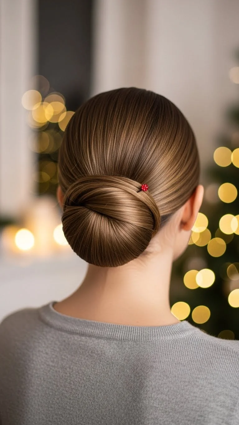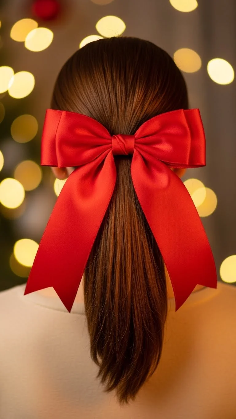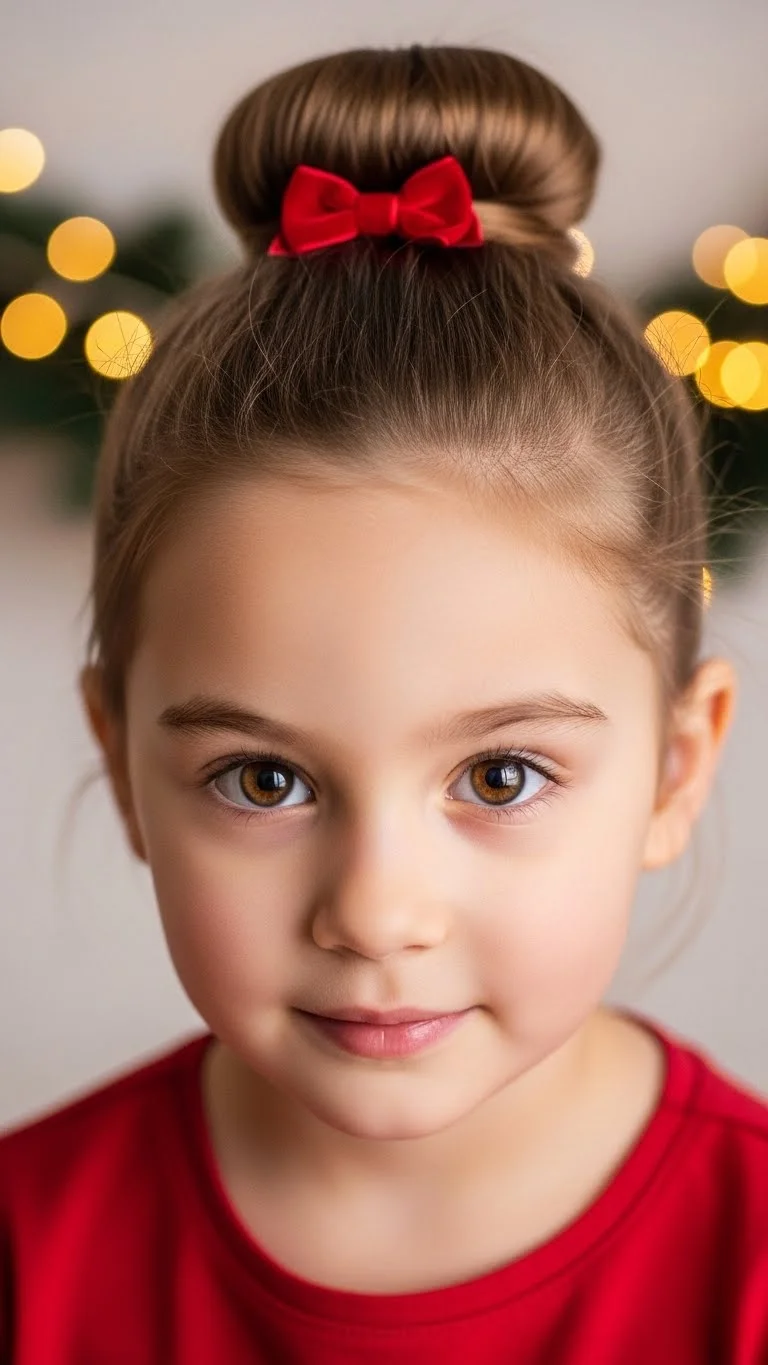 Pull hair into a small bun and add a simple bow clip. Use a donut sponge only if you already have one; otherwise, a natural bun works fine. Keep it soft, not tight. A tiny dab of conditioner on fingertips can shape the edges without buying gel. This style holds well for holiday concerts or long car rides. Swap the bow color—green, gold, or plaid—to match outfits.