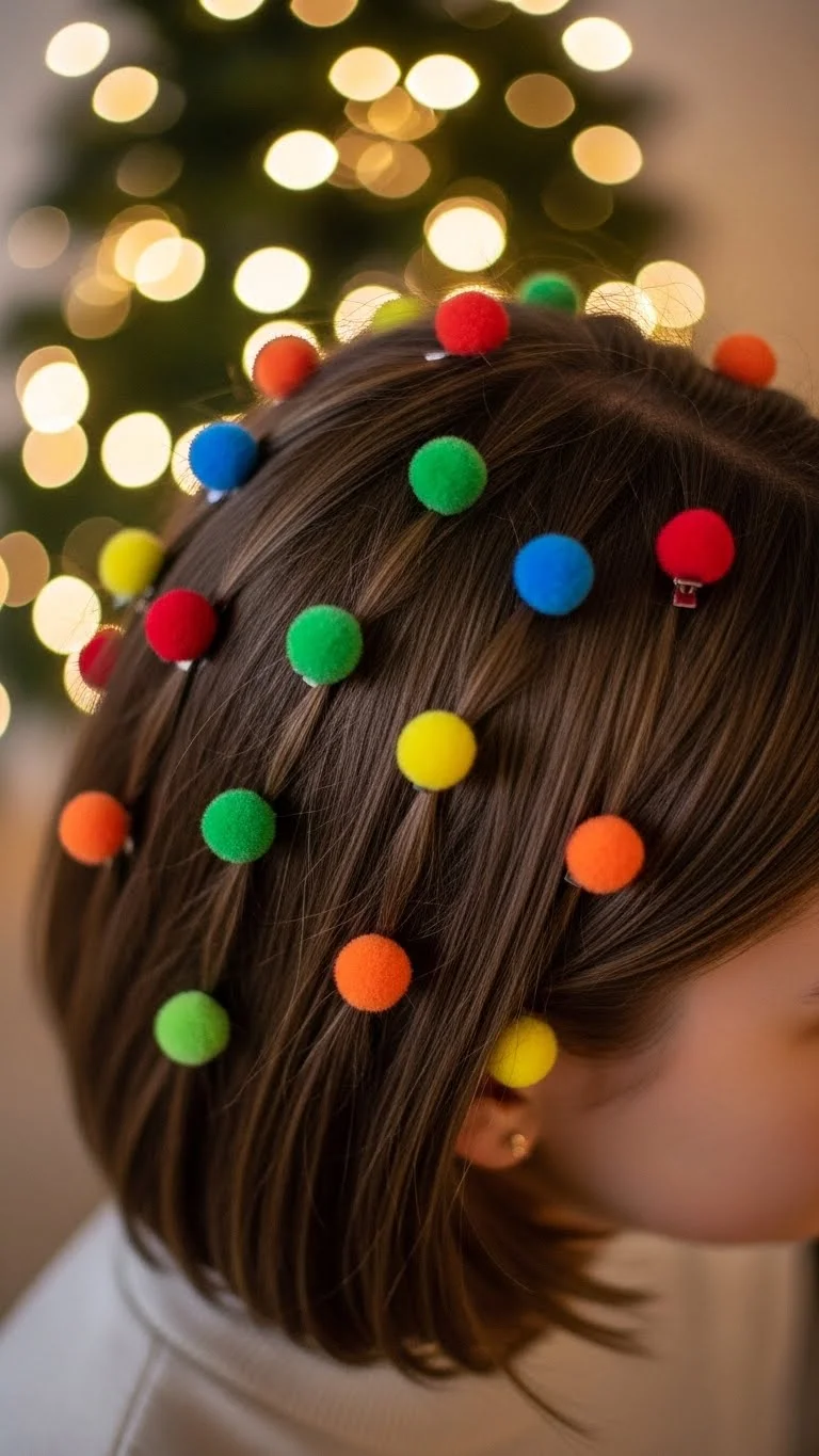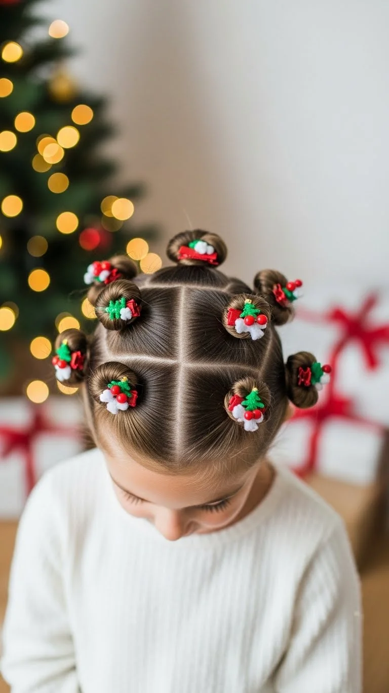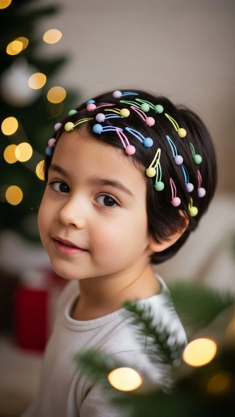 Place small round clips throughout the hair to mimic mini ornaments. Scatter them randomly for a playful look. This works wonderfully for short hair that can’t be braided. Clips from discount stores work fine. Kids love choosing their colors. It takes less than two minutes and looks adorable for any holiday event.