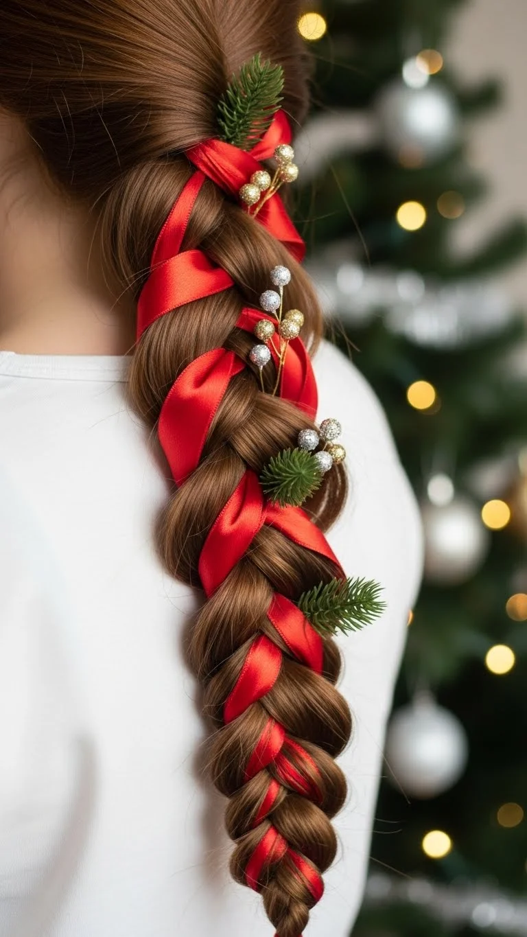 Tie a ribbon at the top of a braid and weave it through as you go. Use a soft ribbon to avoid tangles. This takes only a few minutes and stays tidy all day. The ribbon adds instant holiday flair. Works beautifully for long hair but can also be used with a half-up braid.