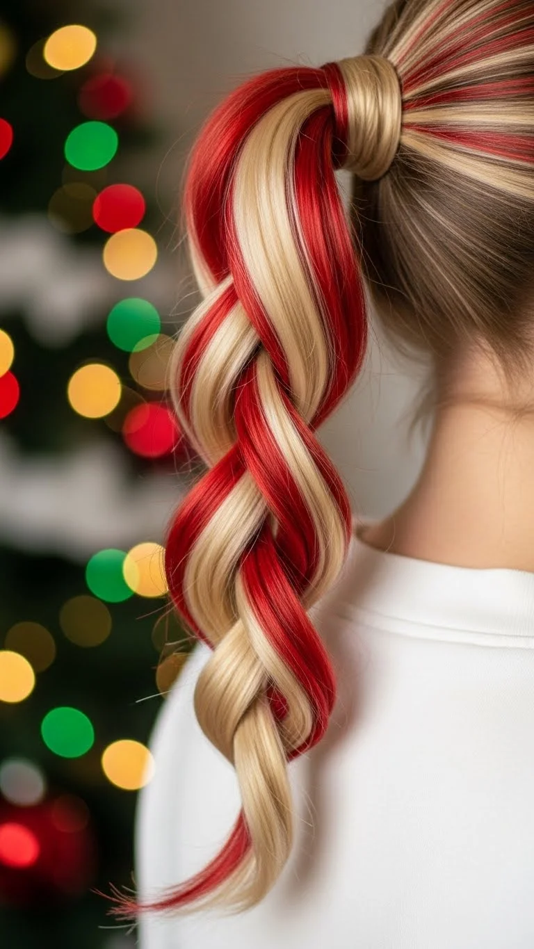 Divide the ponytail into two parts and twist them together. Use red or white elastics to mimic peppermint stripes. This looks bold with barely any work. Kids love the pattern. Works best on medium or long hair. It stays tidy during active play.