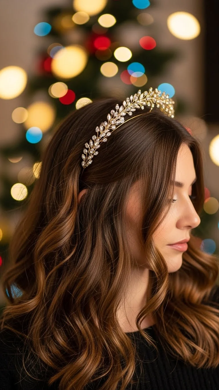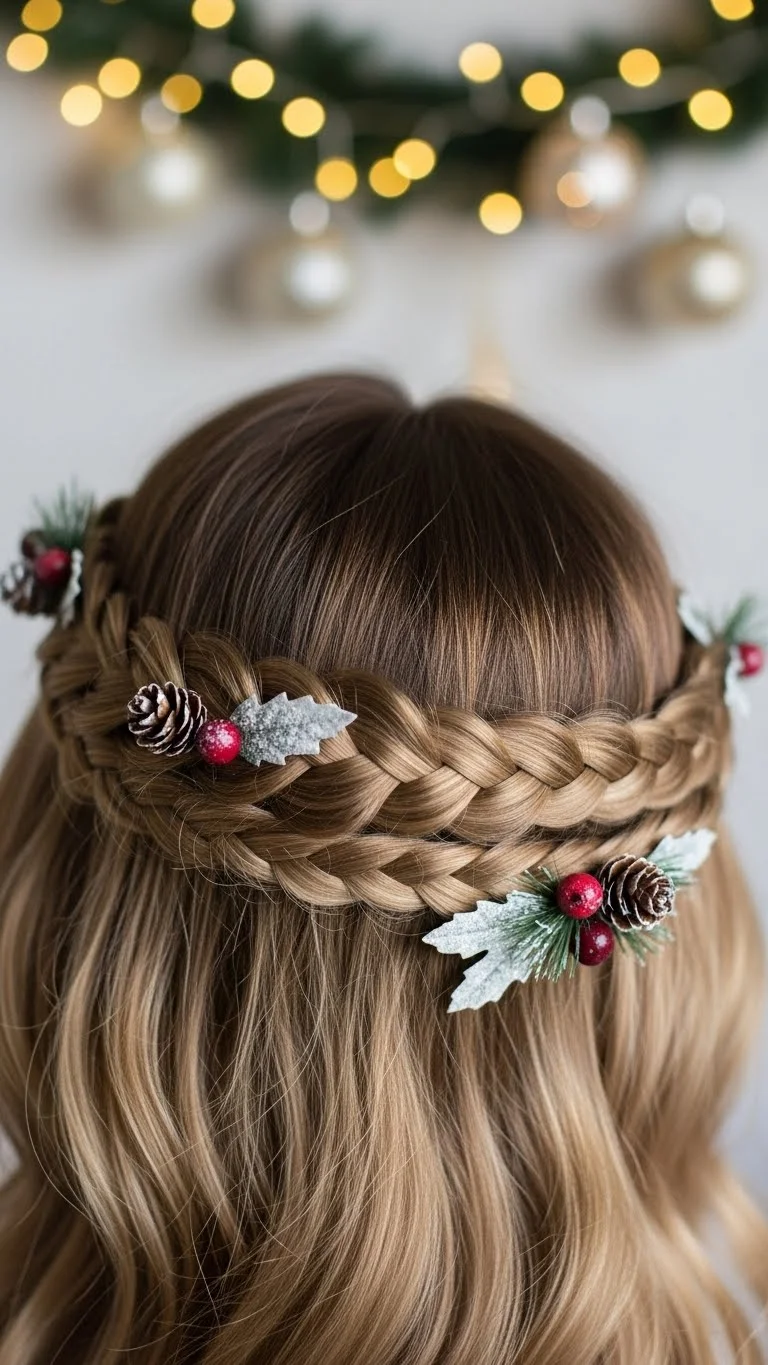 Create loose waves with a simple braid set overnight—no heat needed. Place a thin green headband on top for a “garland” look. If you don’t have a headband, twist a ribbon into a circle. The waves are soft and comfortable, making it great for all-day wear. This style is perfect for matching holiday pajamas or simple family photos.