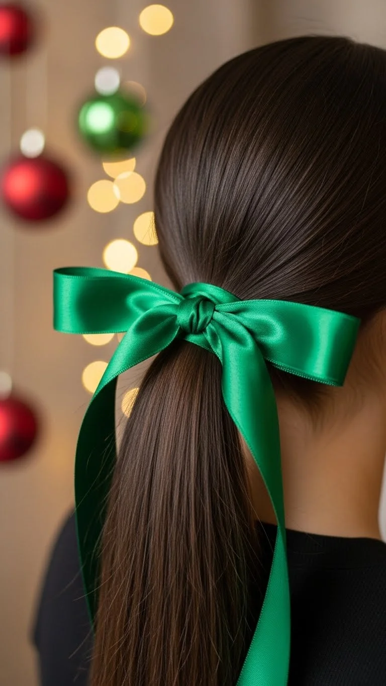 Make a low pony and wrap a green satin ribbon around the band. Let the ribbon tails hang long. This looks dressy with almost no effort. Works on all hair textures. You can cut an old fabric strip if you don’t have satin ribbon at home.