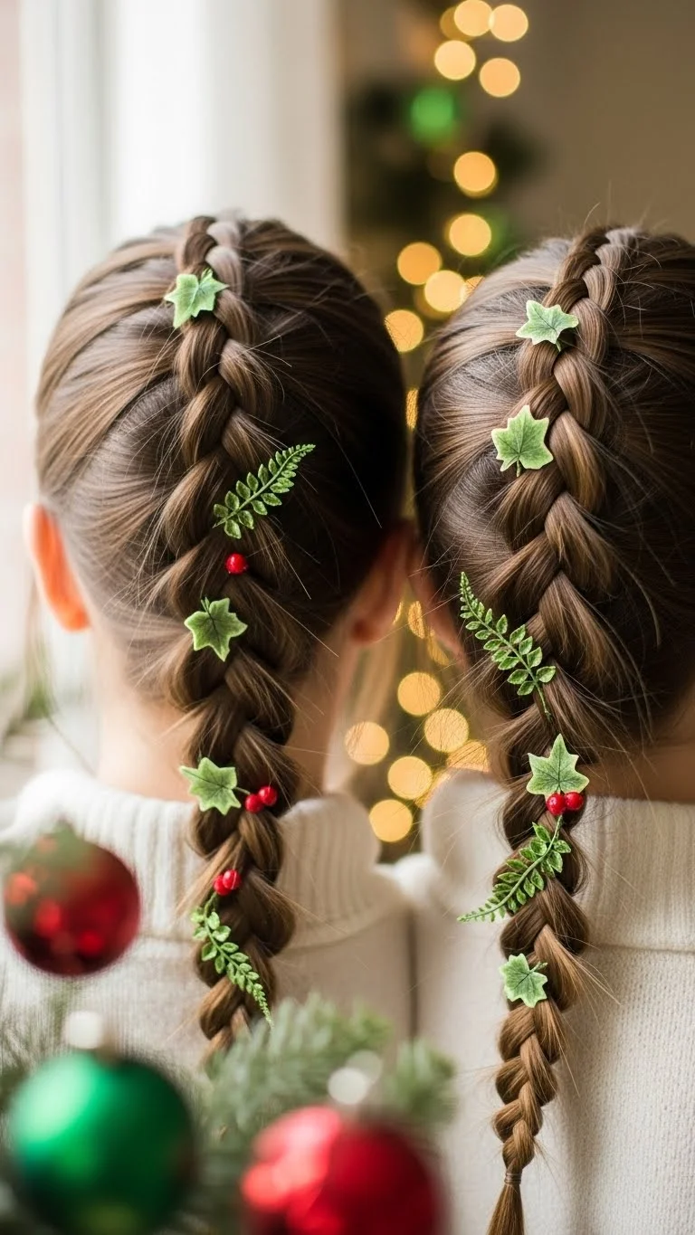 Make two braids and clip tiny red and green accents near the ends. You can create the “berries” using inexpensive craft beads glued to bobby pins. Kids like the cute holiday color combo. This style works best on medium to long hair but can be adapted by braiding only the front pieces. It stays tidy during play and takes under five minutes.