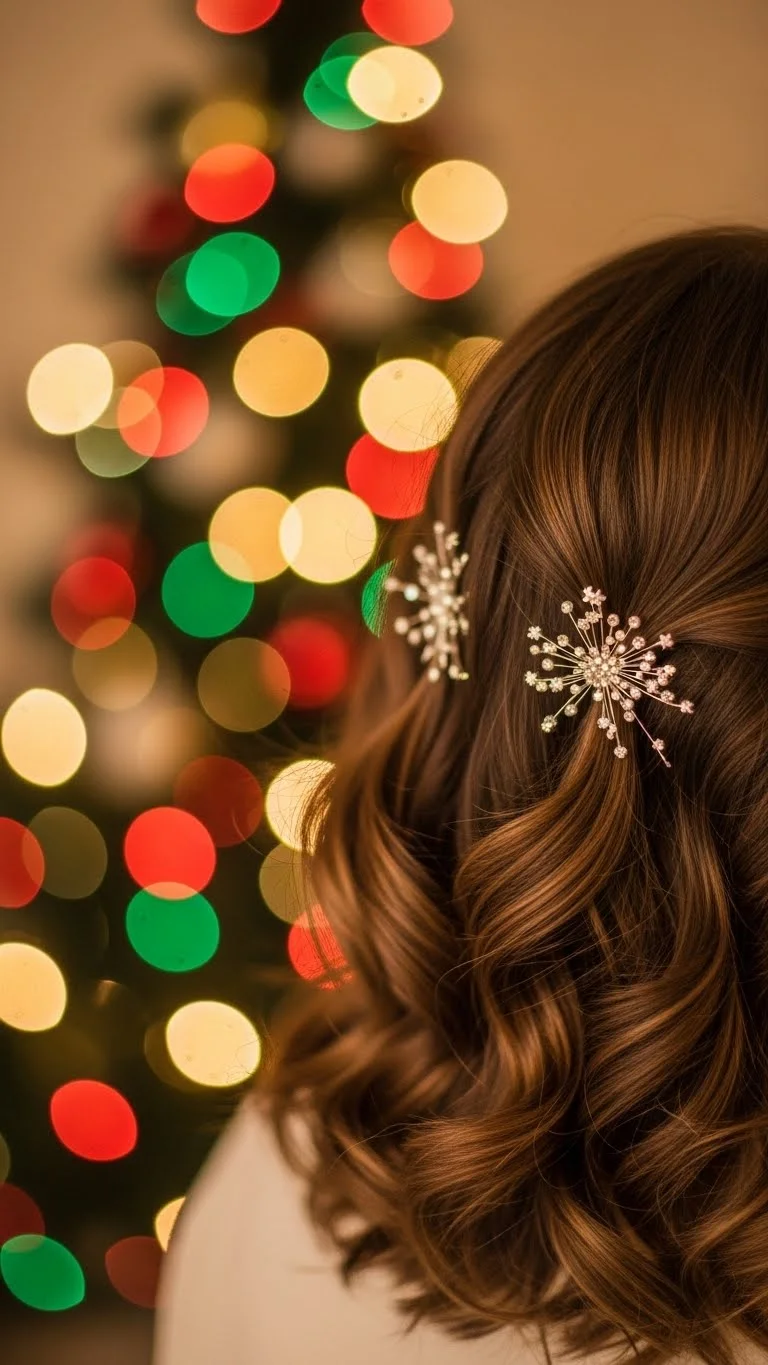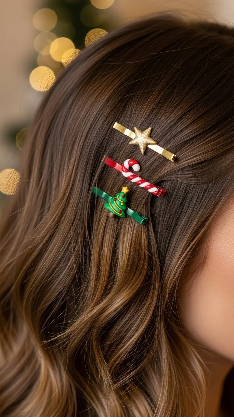 Place two or three holiday barrettes along one side of your head. Keep them in a straight line for a neat look. Barrettes with stars, pearls, or metallic details add simple charm. Style your hair straight or wavy—either works. Budget sets are easy to find online or locally. This is great when you want quick sparkle without heavy styling.