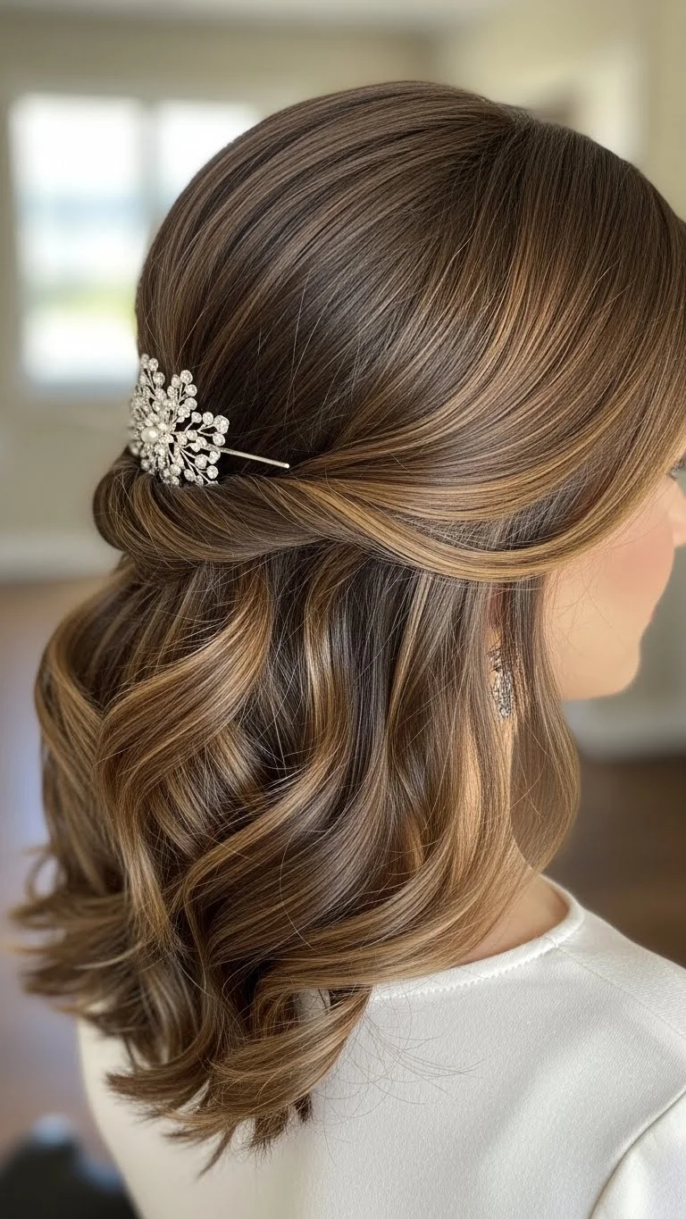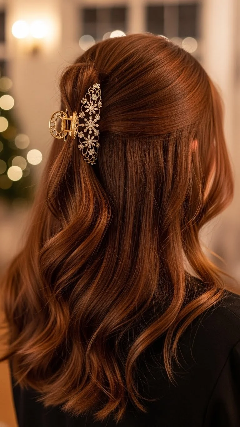 Sweep your hair to one side and secure it with a decorative pin. Choose a pin with small stones or pearls for a gentle sparkle. Curl the opposite side softly so it drapes over your shoulder. This style works well if you’re short on styling time. Keep your brush strokes light so the hair falls naturally. Look for pins in budget-friendly accessory shops or holiday markets.