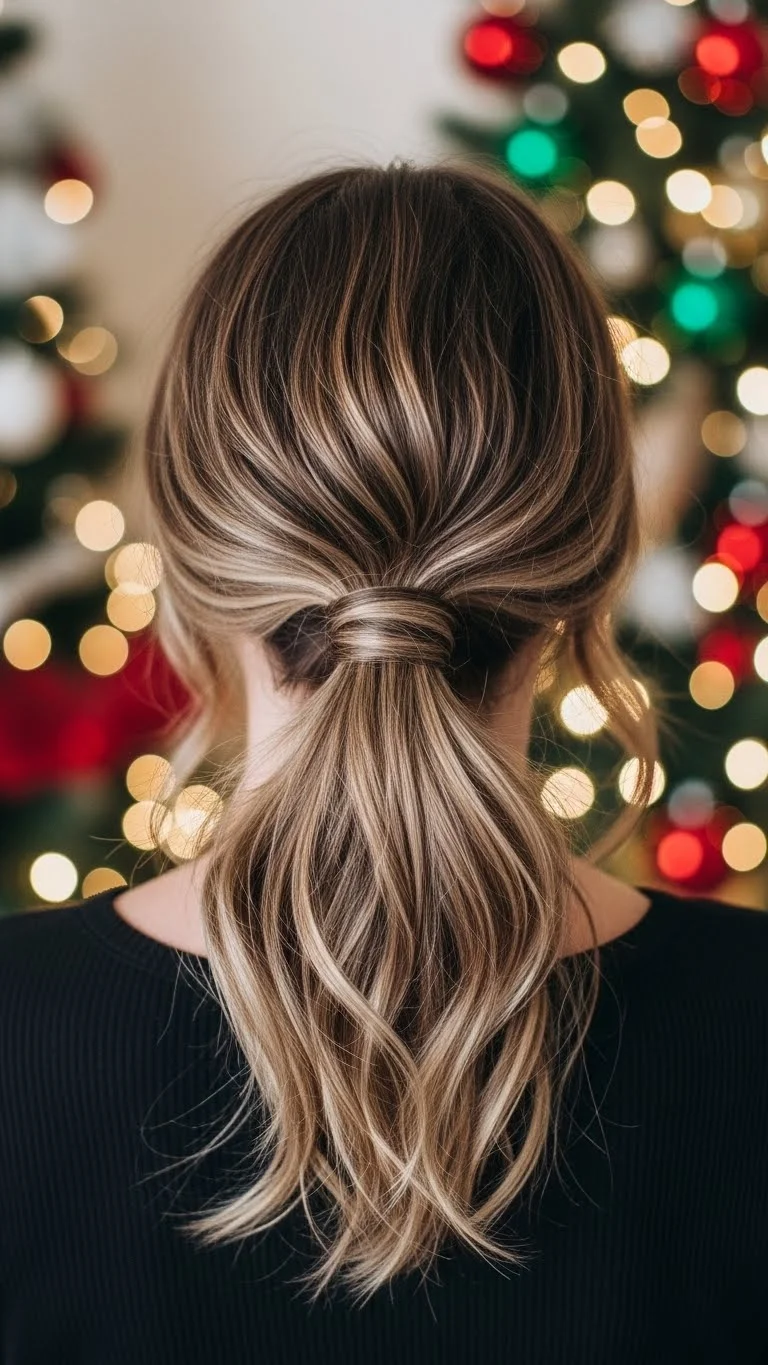 Pull your hair into a relaxed pony near the nape. Let pieces fall naturally around the face. This gives a soft, warm vibe perfect for casual gatherings. Curl the loose pieces for light texture. Keep the elastic loose so the pony doesn’t look stiff. If you want extra charm, wrap a strand of hair around the elastic. A tiny holiday pin near the base adds a simple sparkle.