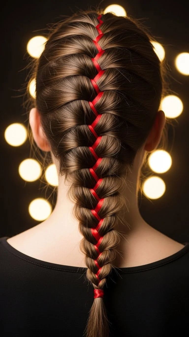 Thread a ribbon through your hair as you braid. Keep the ribbon flat so it shows clearly. This adds a holiday pop without extra tools. Use any fabric ribbon you already have. If your hair is layered, braid loosely so shorter pieces blend in. Tie the ribbon at the end with a small knot. Works great for outdoor market strolls or relaxed family events.