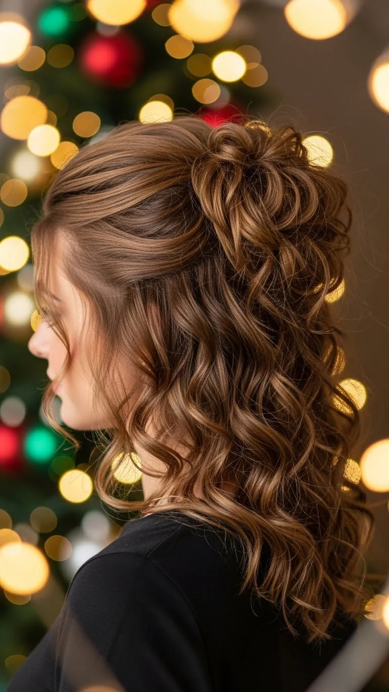 Gather the top half of your curls and secure them into a small puff. Let the rest fall naturally. This gives height without pulling tightly. Add a small clip or bow if you like festive details. Use a curl cream to shape frizz if needed. For budget-friendly options, drugstore curl creams work well. This look highlights your natural texture in a relaxed holiday way.