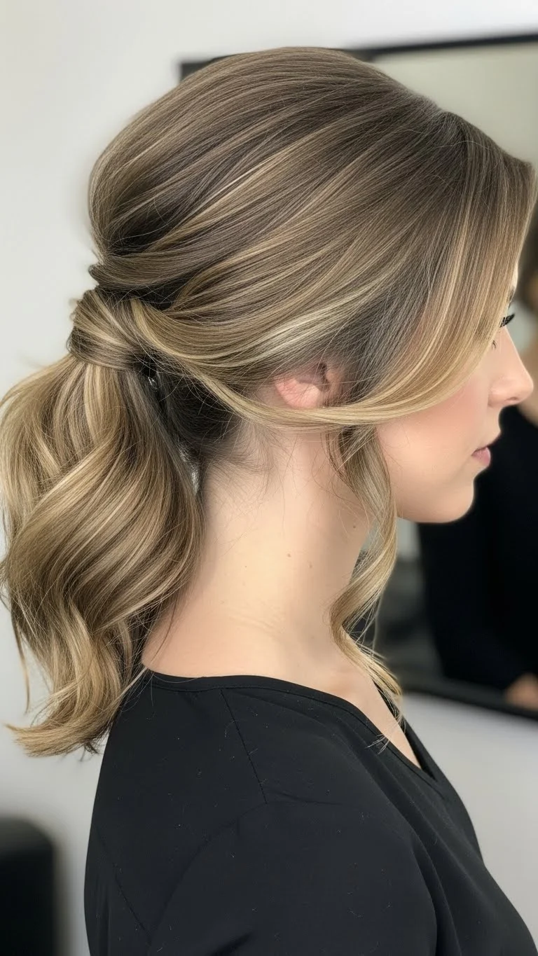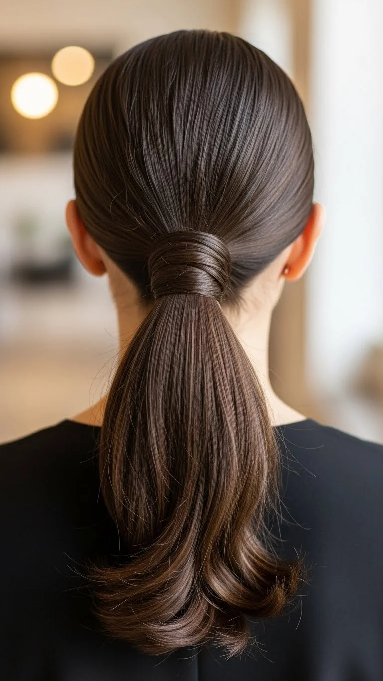 Pull your hair into a low pony. Take a small strand from underneath and wrap it around the elastic. Pin it underneath. This simple detail gives a neat finish. Curl the ends if you want softness. Works well with smooth or wavy textures. Add a small metallic pin at the base for gentle holiday shine.