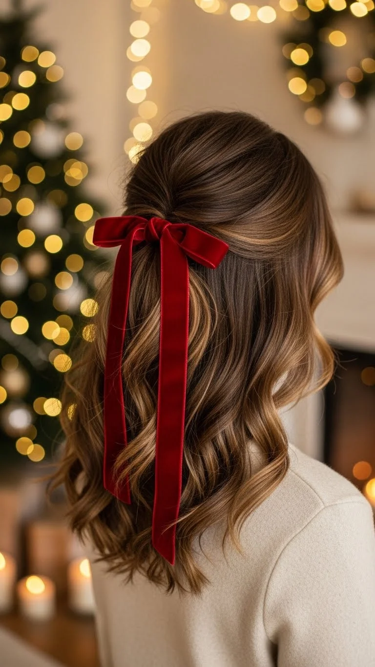 Gather the top half of your hair and secure it with a small elastic. Wrap a velvet ribbon around the base and tie a short bow. Velvet adds holiday charm without much effort. Keep the bow slightly off-center for a relaxed feel. If your hair is fine, tease the crown lightly before pulling it back. This adds shape without needing extra products. You can curl the loose bottom section for texture or keep it straight for a cleaner look. Velvet ribbons from craft stores cost very little, and you can cut them to your perfect length. For a fun touch, choose ribbons that match your outfit or gift wrap theme. Simple, cute, and perfect for last-minute styling.