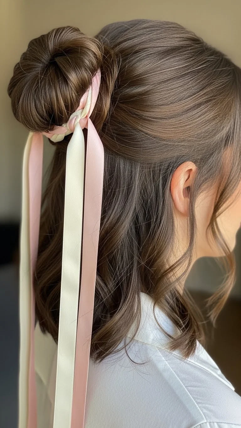 Tie your hair into a loose bun at the back. Add a ribbon with long tails. The ribbon moves gently when you walk and feels festive without effort. Keep the bun soft so pieces fall naturally. Use inexpensive satin or velvet ribbon for a warm holiday feel.