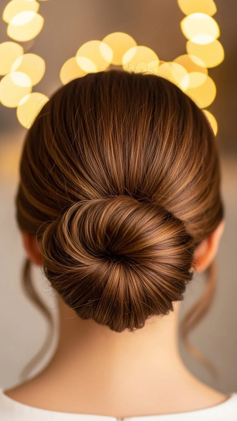 Gather your hair at the nape and twist it into a small bun. Pin it securely. Leave two face-framing pieces loose for softness. Twist the side sections and wrap them gently around the bun. Use basic bobby pins; no fancy tools needed. If your hair is slippery, spray lightly first so the bun stays put. This style looks pretty with sweaters or dresses. It’s comfortable enough for long gatherings and easy to redo if needed.