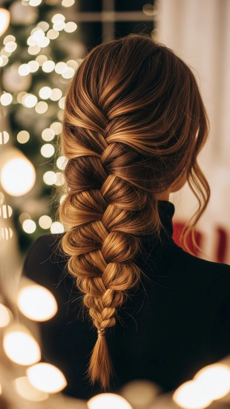 Braid your hair loosely so it feels relaxed. Pull on the braid edges gently to make it fuller. Tie the end with ribbon or a neutral elastic. For a festive touch, weave a thin metallic string through the braid. Keep it simple so it doesn’t tangle. If pieces fall out around your face, let them stay for softness. A loose braid stays comfortable during long dinners or gatherings.