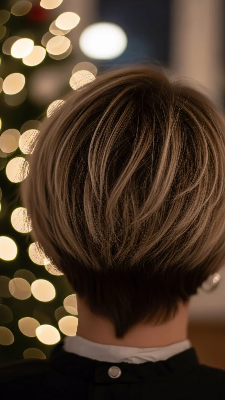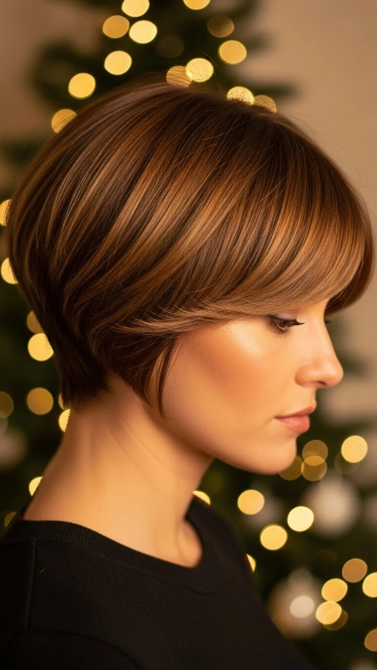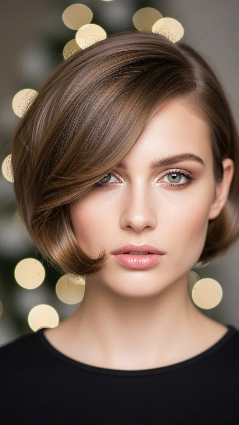 A micro bob looks fun when styled with gentle texture. Spray a light mist of water on dry hair, then scrunch with a dab of mousse. Let it air-dry if you prefer low heat. The goal is a casual, festive shape that doesn’t look forced. Clip the front pieces with tiny gold pins for sparkle on a budget. If your hair feels too fluffy, smooth the top lightly with your hands. A small side flip adds attitude. This look suits anyone who likes something effortless with a playful twist. It pairs well with bold lipstick or a shimmering eye look. The texture also helps fine hair appear fuller without heavy products. Perfect for a quick style change before a party.