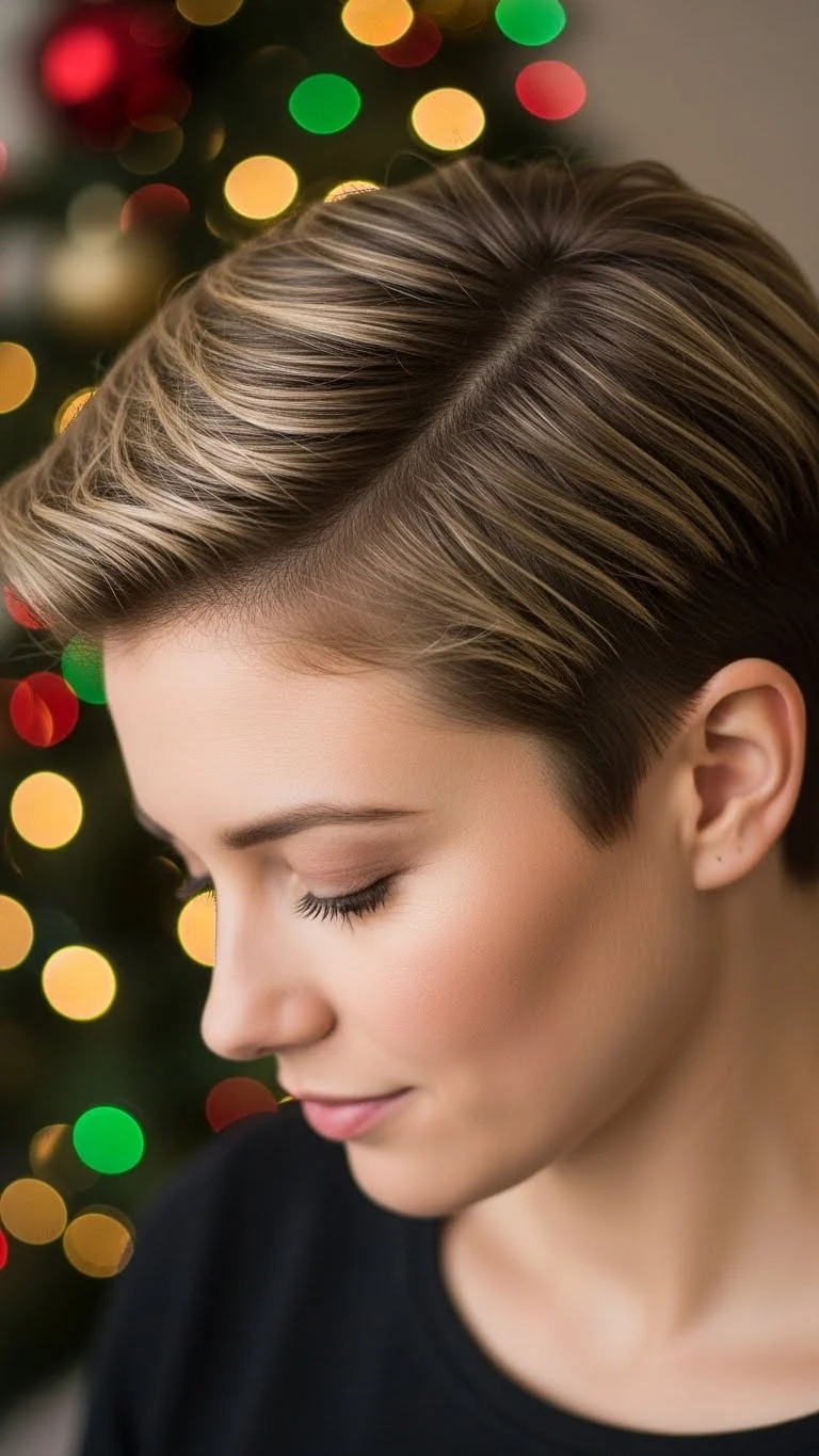 A deep side part can change your whole look. It creates instant shape and makes short cuts feel more glamorous for a Christmas party. Keep the hair sleek with a smoothing balm. Comb it through from roots to ends and blow-dry in the direction you want the part to fall. This takes only a few minutes. You can tuck one side behind your ear for a clean finish. If you want a subtle shine, add a drop of oil at the ends. Drugstore oils work fine in tiny amounts. This style photographs nicely and works with any outfit—from cozy sweaters to sparkly dresses.