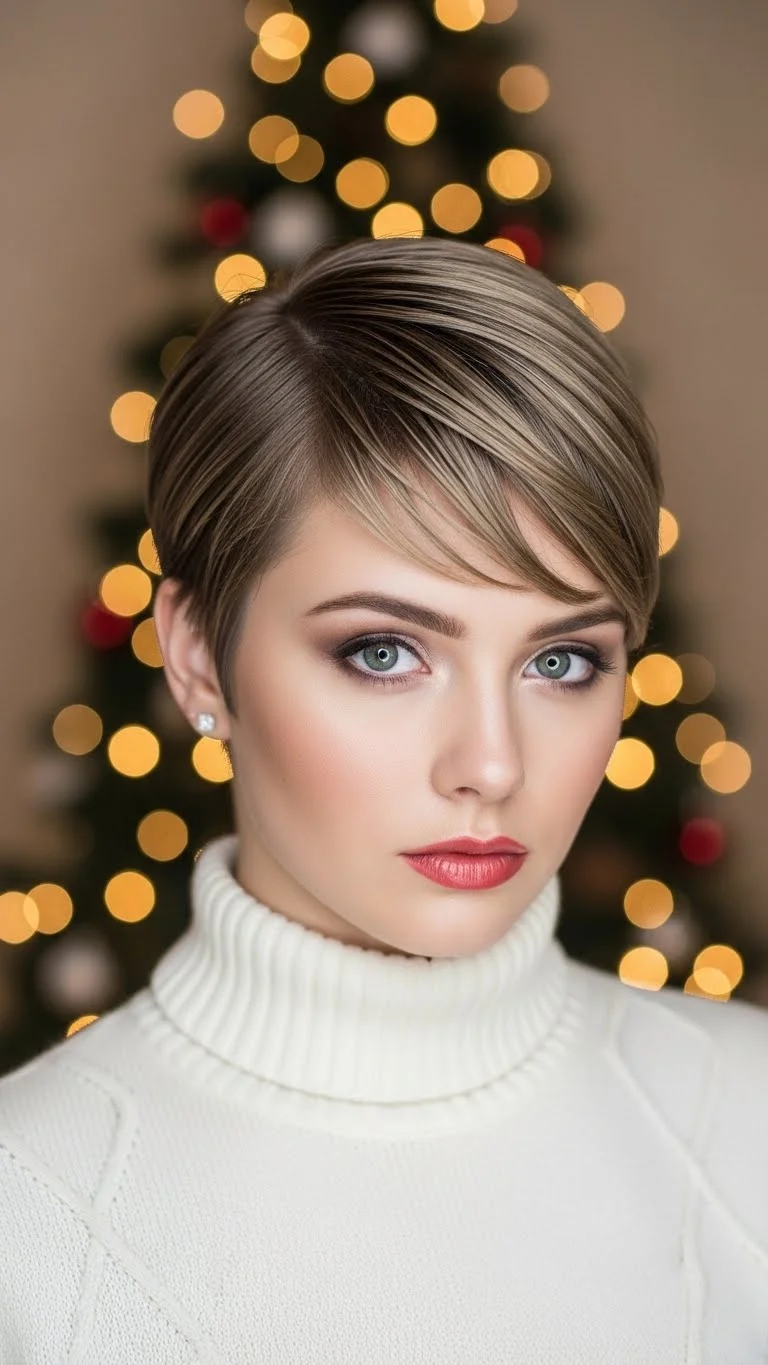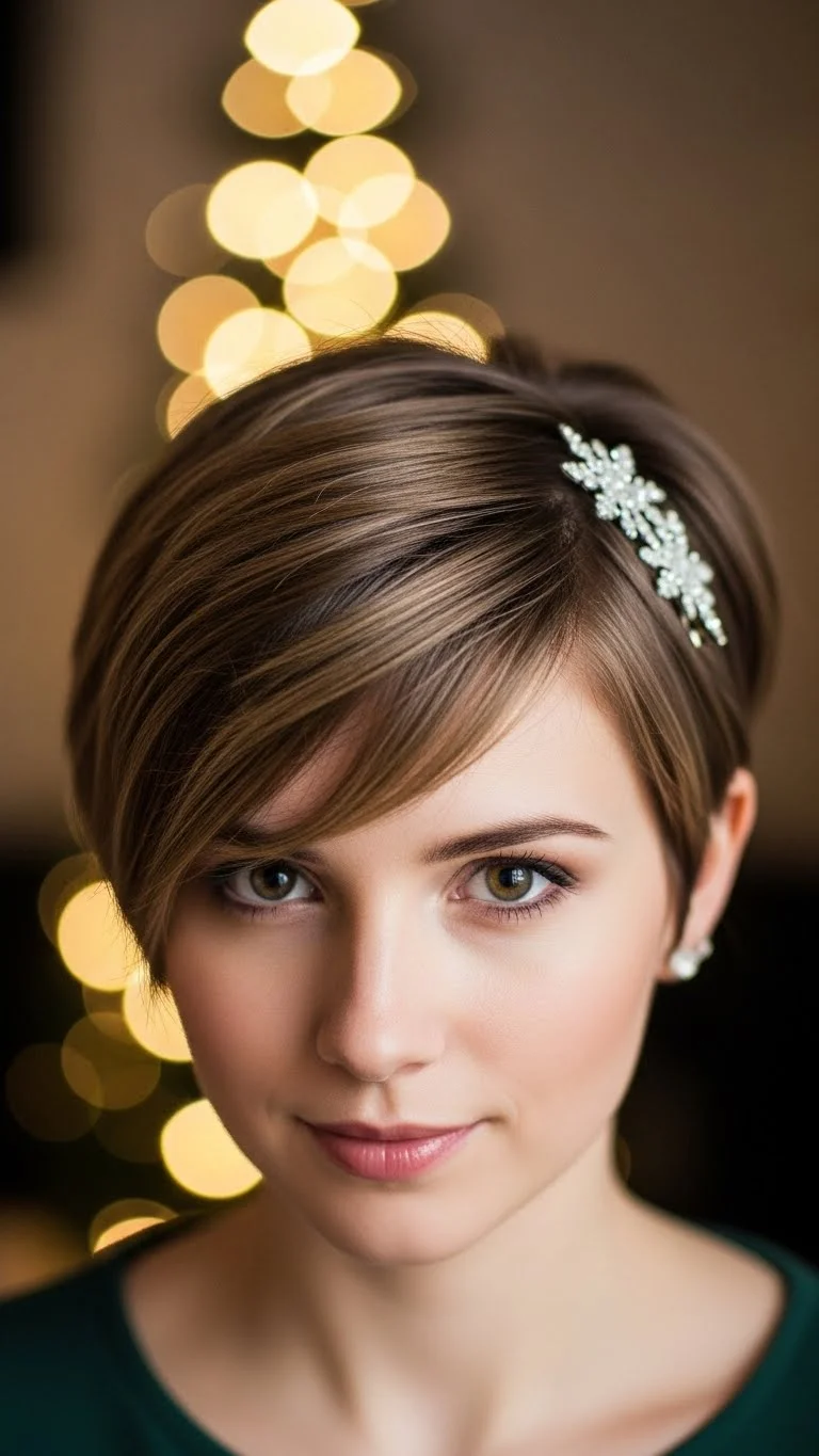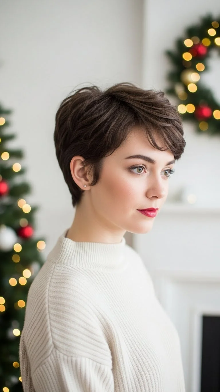 A rounded pixie with feathering at the front looks soft and flattering. Blow-dry the bangs forward with your fingers to keep them natural. Use a dime-sized amount of lightweight cream to define the ends. If your hair tends to flatten, pinch sections upward while the product is still damp. It gives gentle lift without tools. You can add a small sparkly pin above one eyebrow for a festive detail. This style takes only a few minutes but looks polished for any holiday gathering.