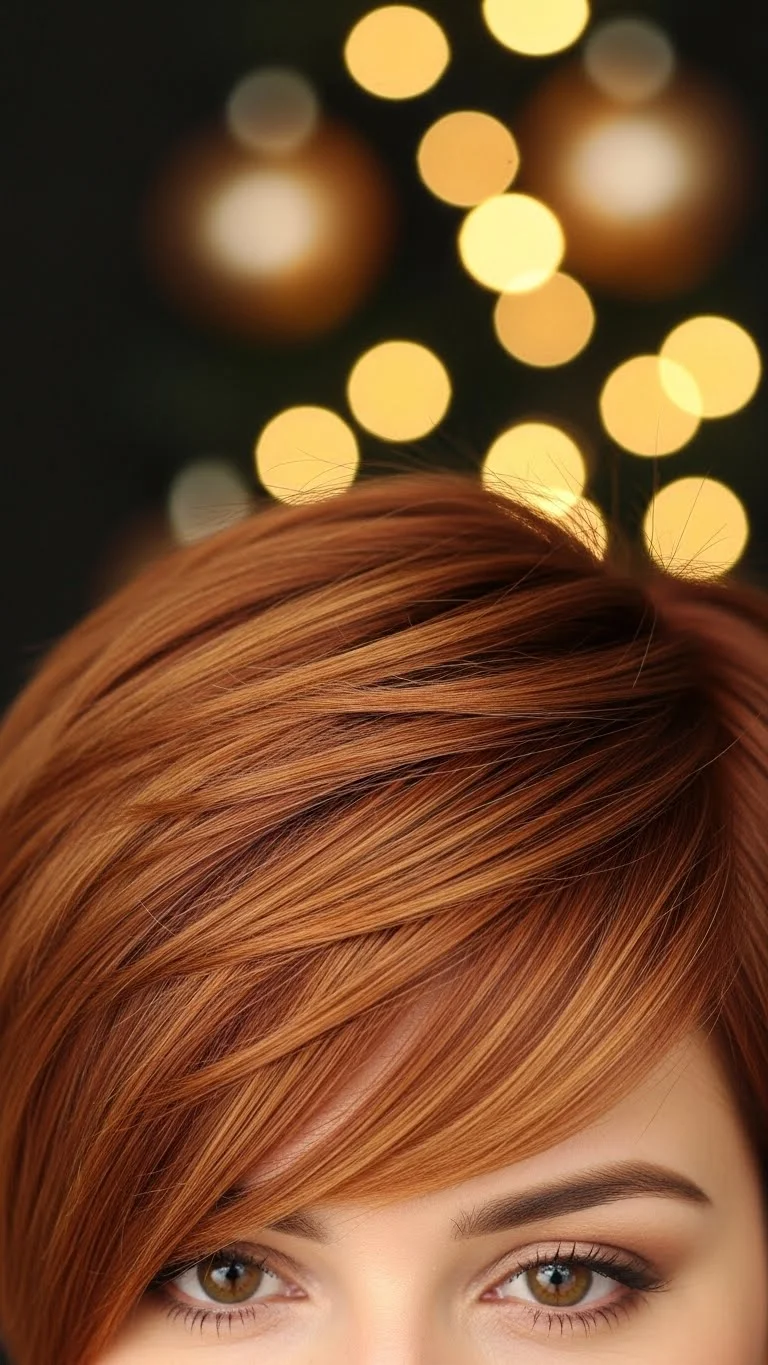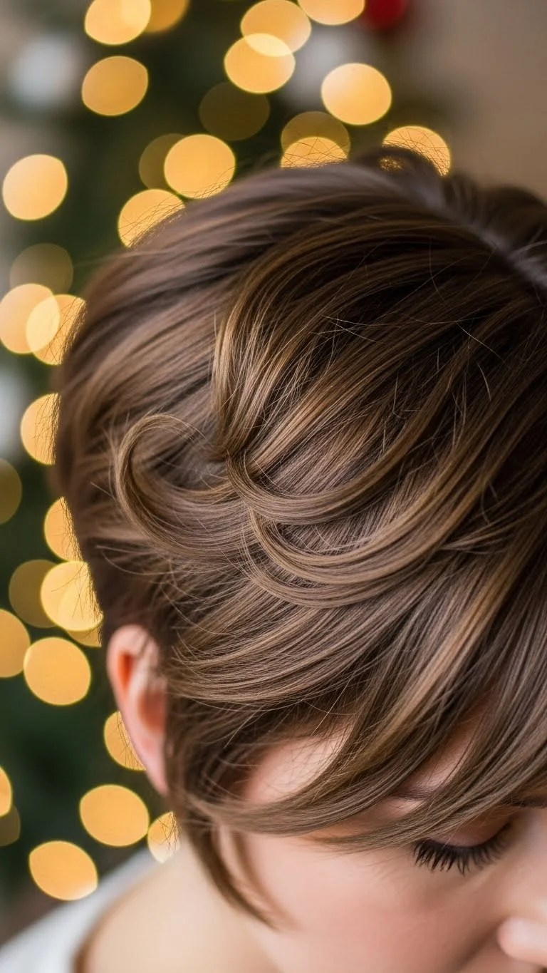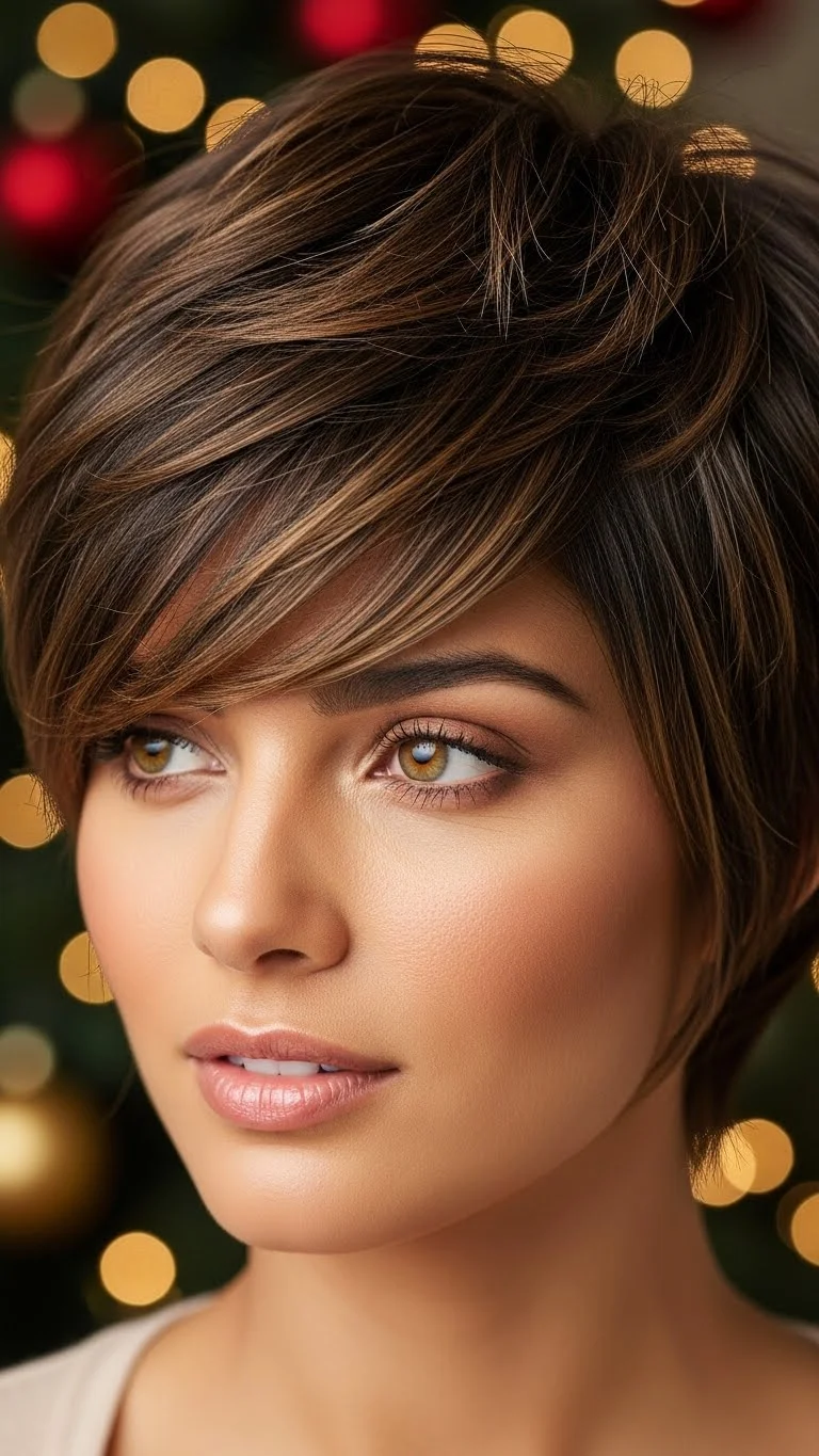 A rounded pixie with feathering at the front looks soft and flattering. Blow-dry the bangs forward with your fingers to keep them natural. Use a dime-sized amount of lightweight cream to define the ends. If your hair tends to flatten, pinch sections upward while the product is still damp. It gives gentle lift without tools. You can add a small sparkly pin above one eyebrow for a festive detail. This style takes only a few minutes but looks polished for any holiday gathering.