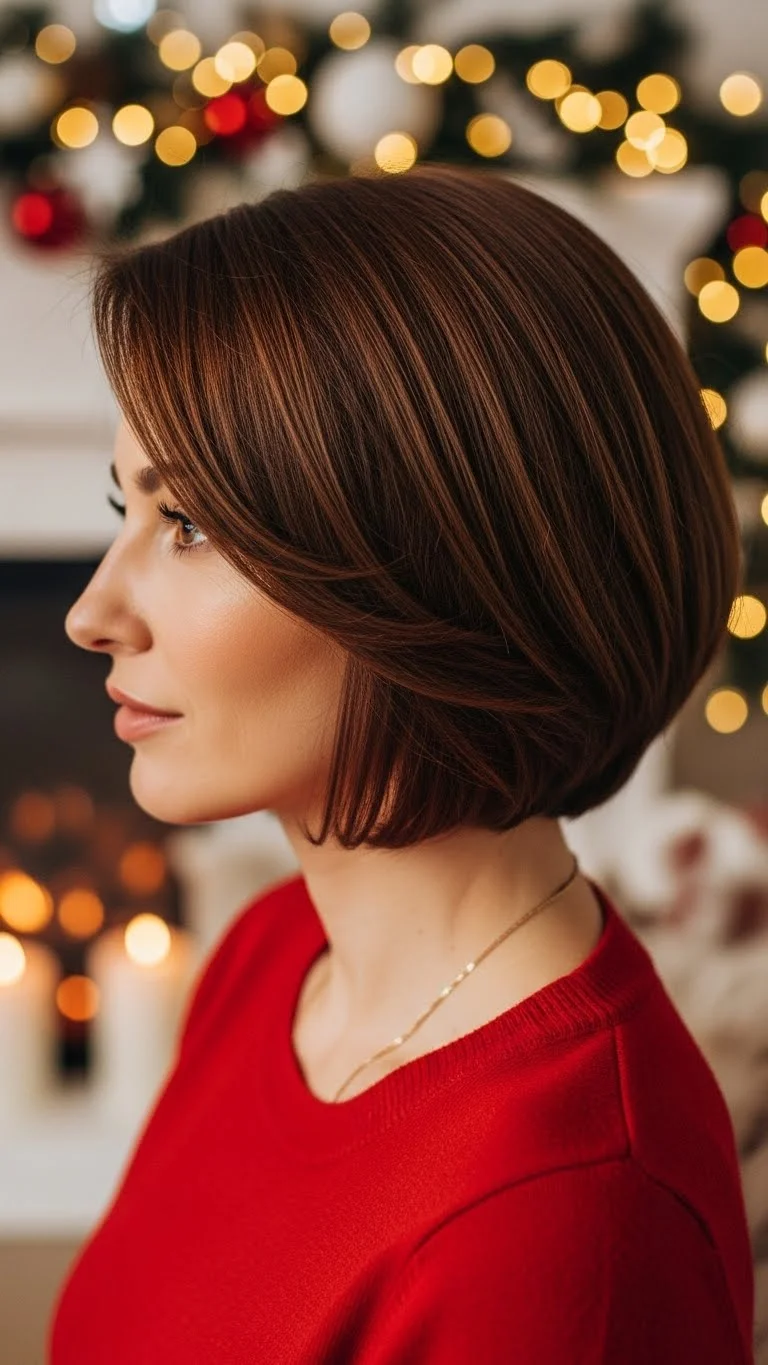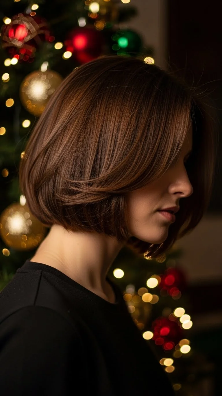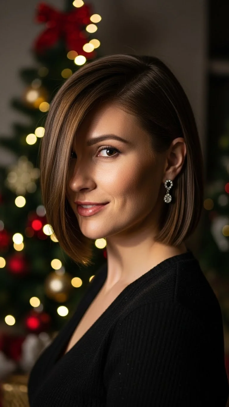 Warm curls give even the simplest bob a party-ready feel. Work with a small curling wand or a straightener if that’s what you already have. Keep curls loose so the shape stays airy. A side sweep adds a little drama without extra steps. If your hair falls flat fast, mist a light setting spray before curling. It helps the shape last longer. You can pin one side with a simple metallic clip from a discount store. It costs little and adds a festive detail. If you want a smoother finish, run a tiny bit of cream through the ends. For extra volume at the crown, flip your part in the opposite direction. It takes seconds and creates natural lift. This style works well for anyone who prefers a soft, classic holiday look that photographs well.