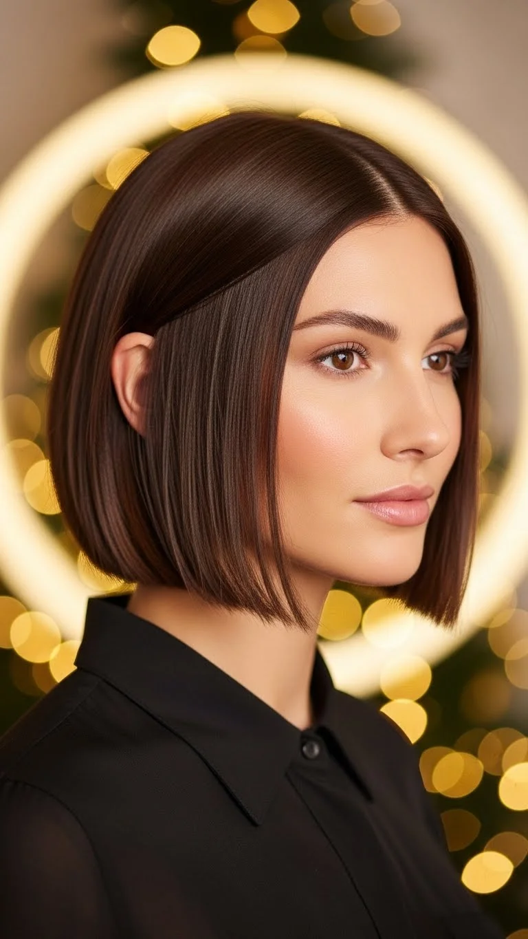 Turning the ends inward creates a tidy holiday hairstyle. Use a round brush or a straightener. Keep the curve soft. Add a touch of smoothing cream so the finish stays neat. You can add a sparkly headband for holiday flair without spending much. This look pairs well with simple outfits and elegant holiday dresses.