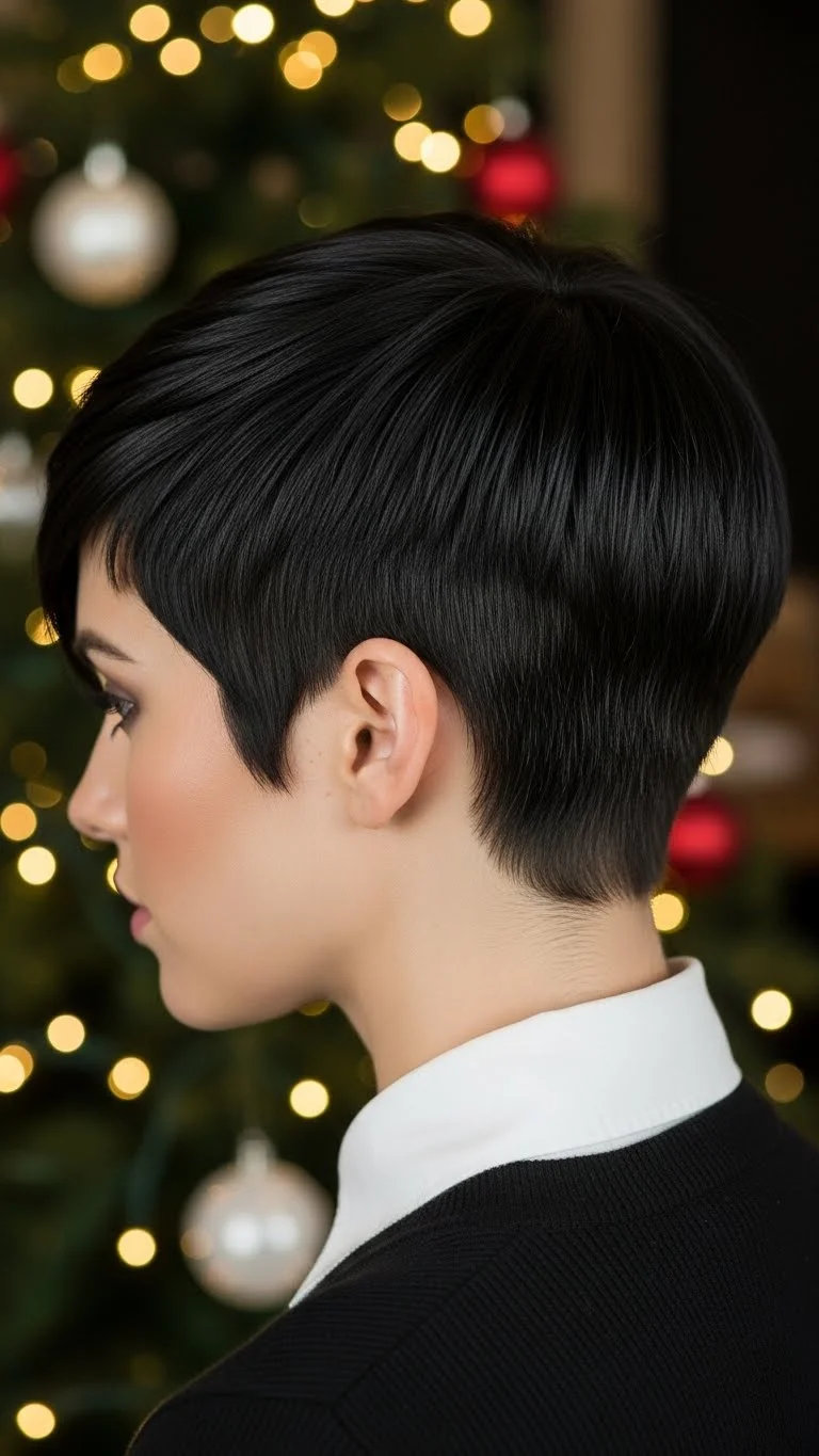 A smooth pixie always looks polished. Start with a small amount of serum to get that reflective surface. Use a flat brush to guide your hair while blow-drying on low heat. Keep everything close to the head so the shape stays sculpted. This works great if you like clean lines and minimal fuss. You don’t need pricey products drugstore serums work fine in tiny amounts. If your hair tends to puff up, press a cool shot of air over the top layer. It helps settle everything. Add a simple ear cuff or sparkly stud earrings for party vibe without overpowering the look. If your bangs are long, sweep them slightly across your forehead for softness. This style fits any holiday setting, from family gatherings to office events.