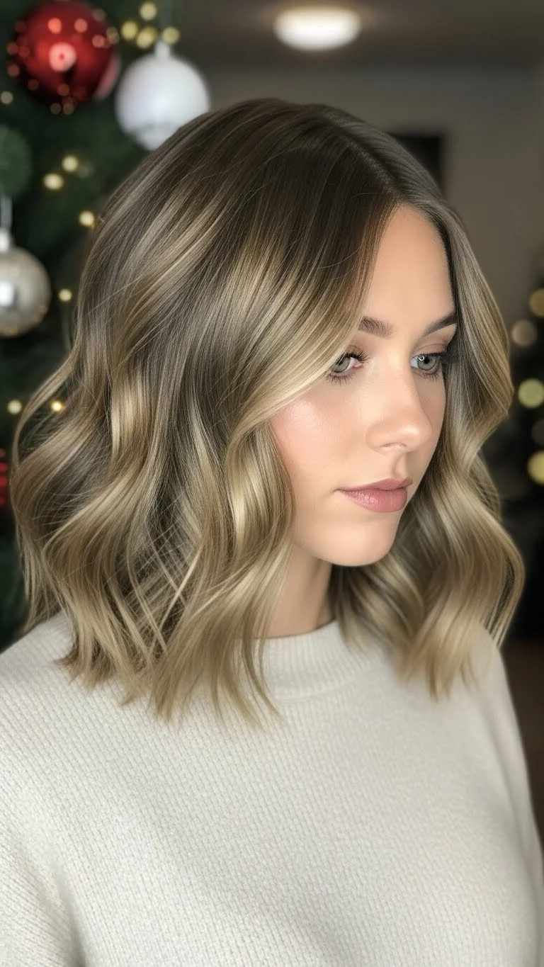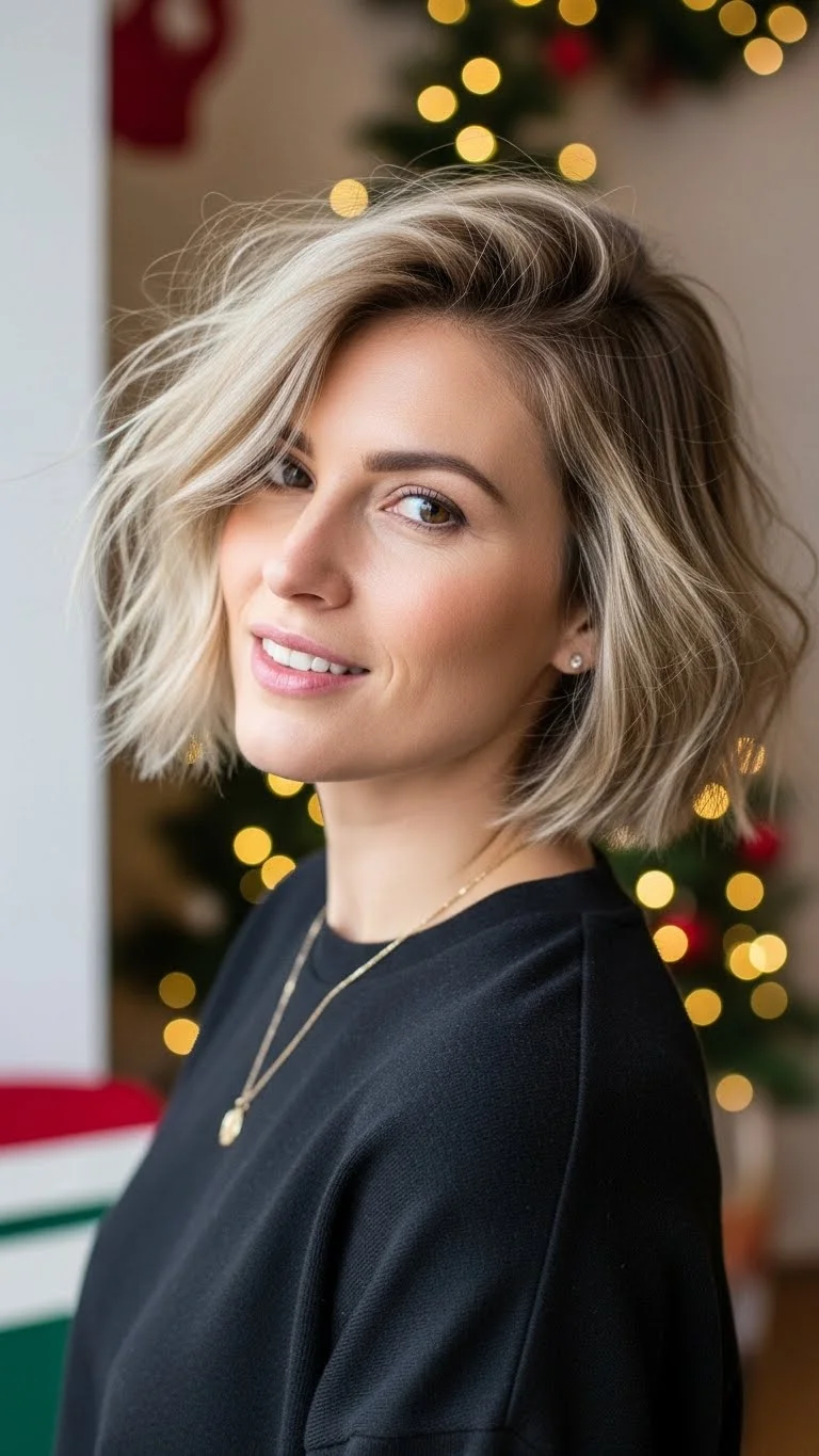 If your hair is slightly longer, a soft wavy lob looks festive and relaxed. Create quick bends with a straightener by twisting your wrist gently as you glide down each section. You don’t need perfect waves. Imperfect texture gives better movement. Spray a touch of dry shampoo to add grip, especially if your hair is silky. A simple pearl clip or tiny barrette can help hold back one side. This style works well if you’re in a hurry. It feels party-ready without looking stiff. Great for casual and dressy events alike.