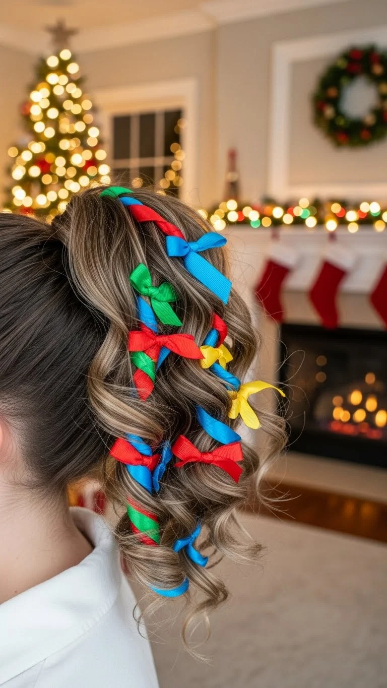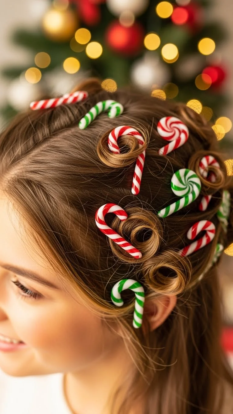 A candy cane headband hairstyle is festive and playful! Use a red or white headband and style curls around it for a unique holiday twist. It keeps hair out of the face while allowing those lovely curls to shine. Perfect for casual gatherings, this is an easy, delightful hairstyle that kids will adore. Go for color combinations that reflect the holiday spirit!