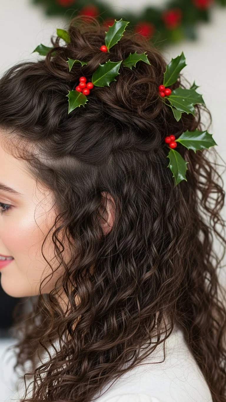 The half-up, half-down style is widely loved and super easy to create. Gather the top section of curls and secure with a cute clip or hair tie. Let the remaining curls tumble down for a relaxed vibe. This style keeps hair manageable while maintaining that fun, curly texture. Consider using a matching ribbon or holiday-themed clip for a festive feel. It’s versatile and works great for any holiday occasion!