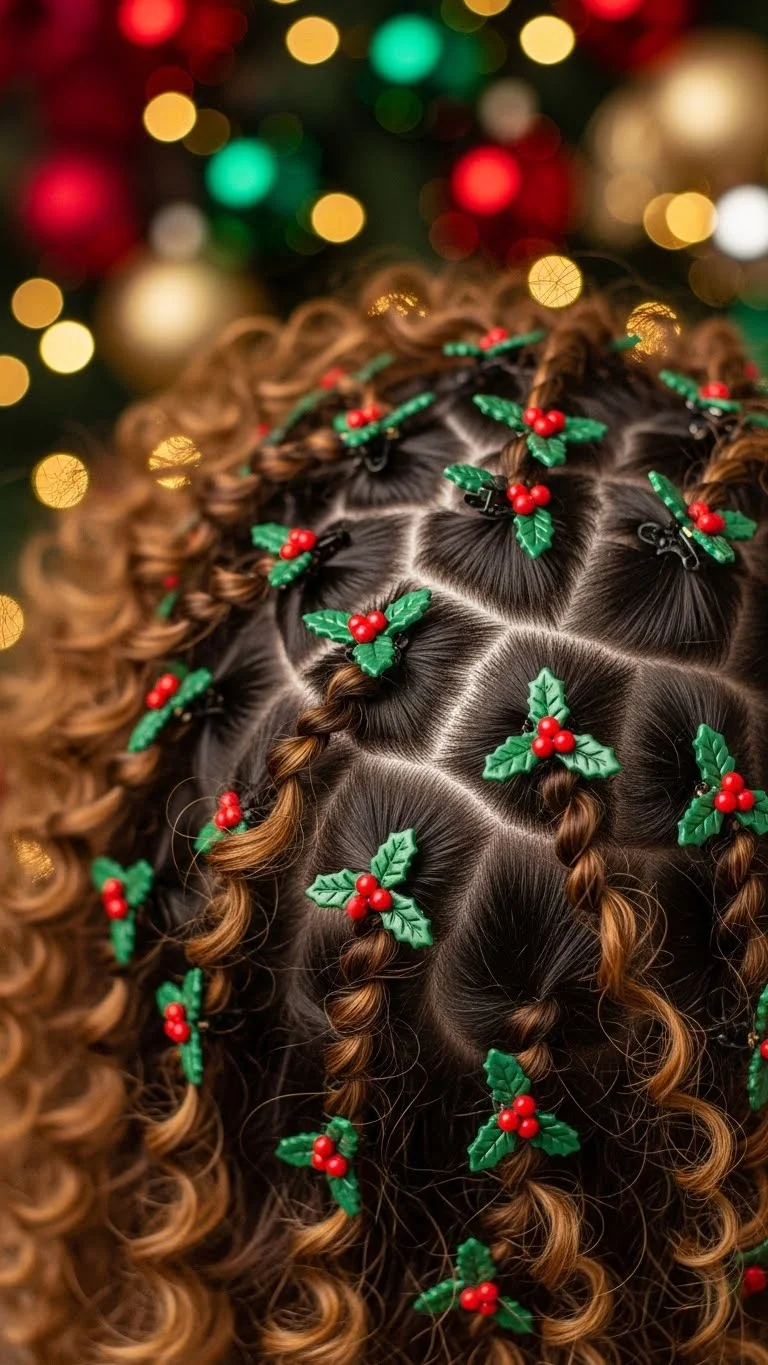 Curly twists with holly clips are both charming and festive. Twist sections of hair and secure them into small buns or twists on the sides. Insert holly-themed clips for a delightful holiday touch. This hairstyle is playful and easy, making it perfect for kids or anyone wanting to embrace the festive spirit. It’s low-maintenance and works beautifully with natural curls!