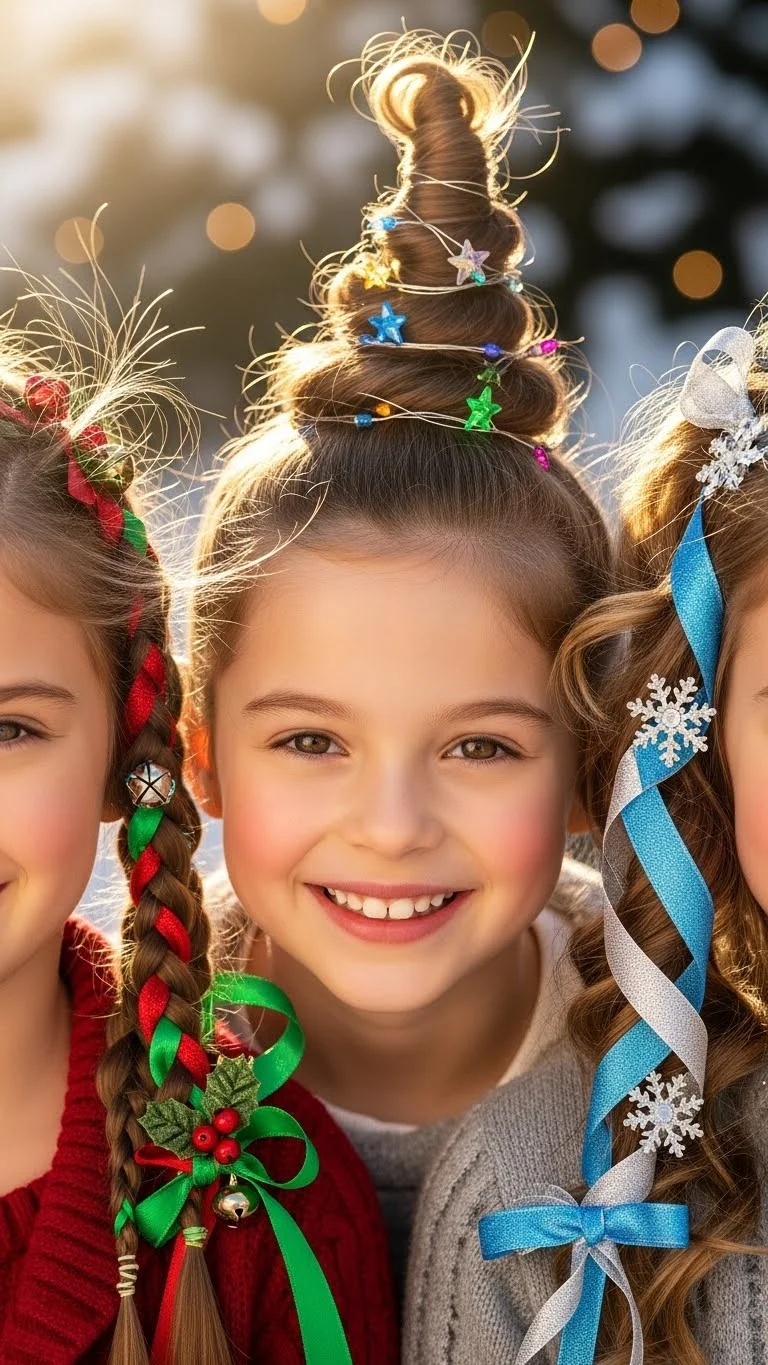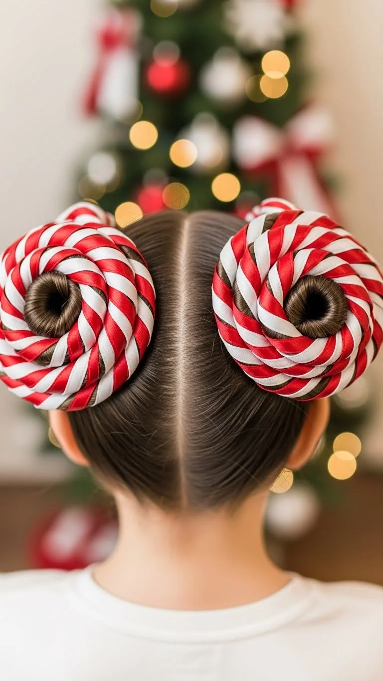 Candy cane twists are easy and playful. Split hair into two sections. Wrap thin red and white ribbons around each twisted piece. Secure with small elastics at the ends. The striped effect looks cute in photos. If hair is short, try one small twist near the top instead of two. Ribbons cost little and come in many textures. You can reuse them after the season too. Avoid pulling too tightly so the twists stay comfy. These work well for quick morning styling or last-minute events.