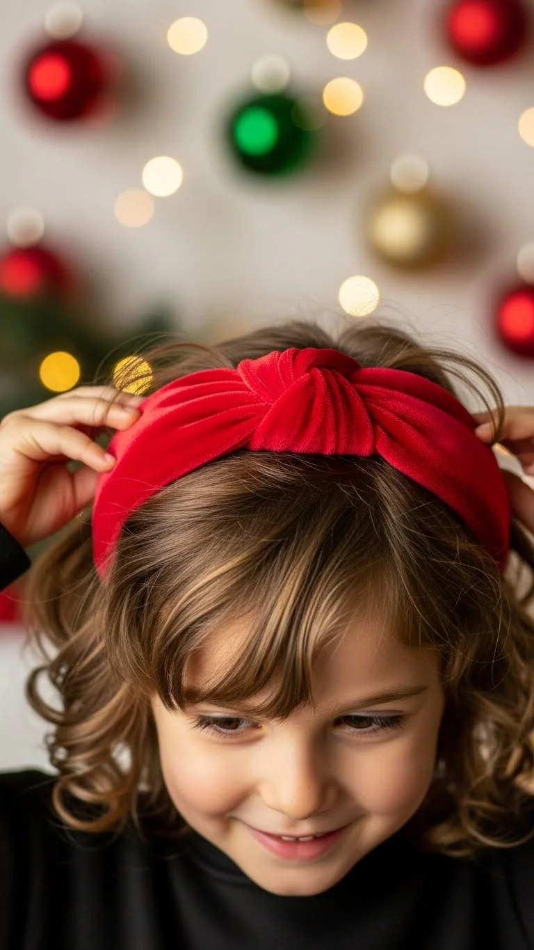 A red velvet headband instantly adds warmth. Slide it over loose or lightly curled hair. The texture looks great in photos. Velvet headbands are inexpensive and come in different widths. If your child has flyaways, sweep hair with a wet brush before placing the band. This simple style works for all hair lengths. Add small clips near the temples if you want sparkle. It’s perfect for mornings when you need a quick fix.