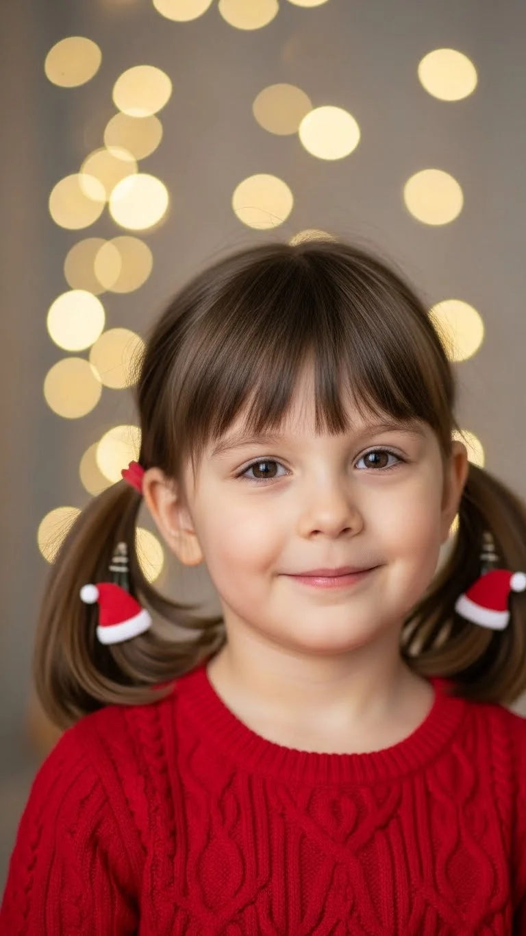 Santa hat pigtails bring smiles fast. Make two low pigtails and clip tiny hat accessories at the base. You can find mini felt hats online or make them yourself. Glue felt to a small clip and let it dry. This style holds up through playtime. For thicker hair, use stronger elastics under the clips. This playful style works for class parties, photos, and cozy nights at home.