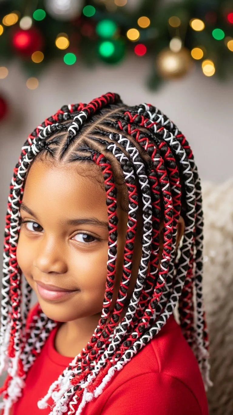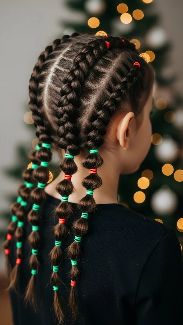 Braided candy loops bring shape and color. Start a regular braid but pull small sections outward to create little loops. Add red and white elastics as accents. This look works best on medium or long hair. If loops slip, dampen the hair slightly before braiding. You can even add sparkly clips at the ends. This style is cute for photos and feels lightweight.